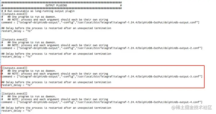 2. 编写对应 [[outputs.execd]] 的配置文件 dolphindb-output-3.conf。这里直接注释掉 database,将 Telegraf 采集的数据导入到 DolphinDB 流表 cpu_stream 中。