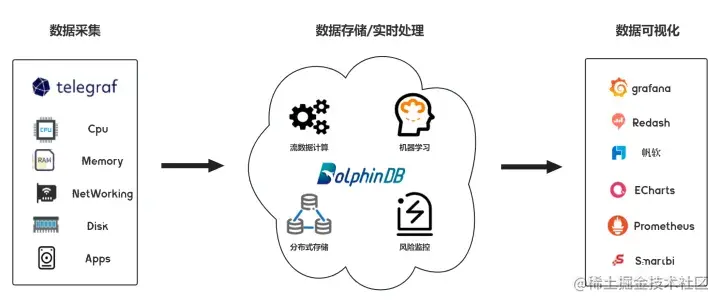 将三者结合,可以快速搭建一套集指标采集、指标存储/实时处理、指标处理结果展示功能于一体的系统。本文详细介绍如何在 Linux 环境中部署 Telegraf 实时采集设备指标数据 ,并使用 DolphinDB 作为输出存储,最终将输出到 DolphinDB 的指标数据在 Grafana 图表中进行展示,完成搭建一整套设备指标实时监控系统,在文章最后提供了一个实际实现案例。