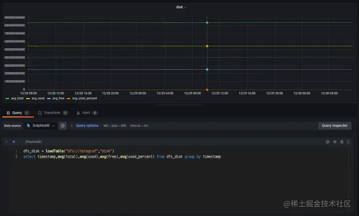 5. 在 Grafana 底部的代码输入栏中输入下方代码(按时间段分组,查询各时间段磁盘总量、使用量、可用量、使用百分比,4个指标数据的平均情况)。