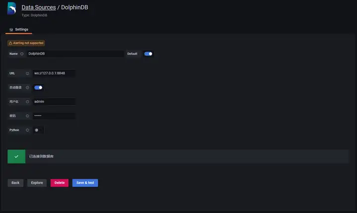 3. 依次点击 “Settings” >> “Data Sources“ >> “Add data source“,在搜索栏中搜索 DolphinDB ,点击并设置其配置项如下(用户名为 admin , 密码为 123456),点击 Save&test 测试连接。
