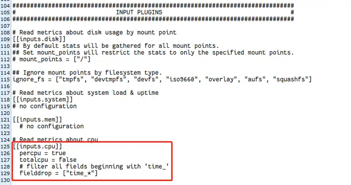 - 修改 Telegraf 的配置文件 TelegrafConfig。在 INPUT PLUGINS 中添加 CPU 监控 [[inputs.cpu]],在OUTPUT PLUGINS 中添加对应 [[outputs.execd]] 输出。