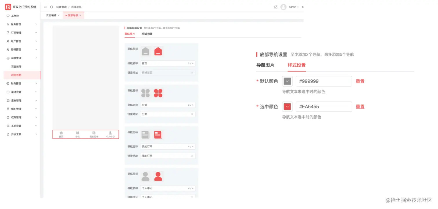 首页轮播图广告、金刚区导航均可自定义配置,打造自己喜欢的商城风格;自定义装修个人中心菜单、我的服务图片可选择不同排版样式;底部导航栏灵活配置,首页菜单不可删除,最多支持添加到5个菜单