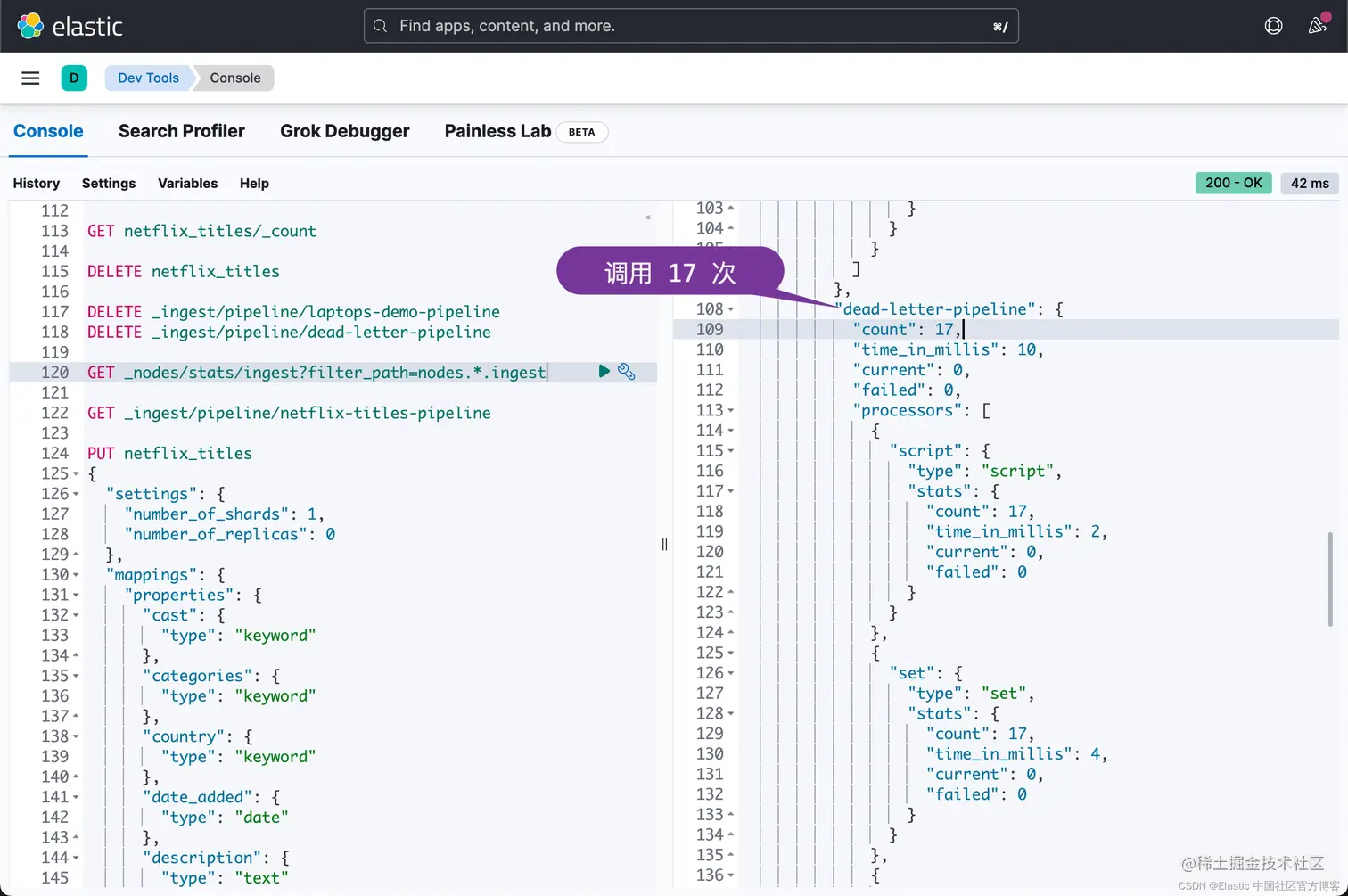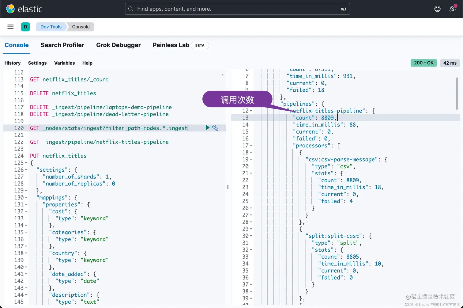 这次再让我们来检查一下 ingest pipeline 的统计情况: