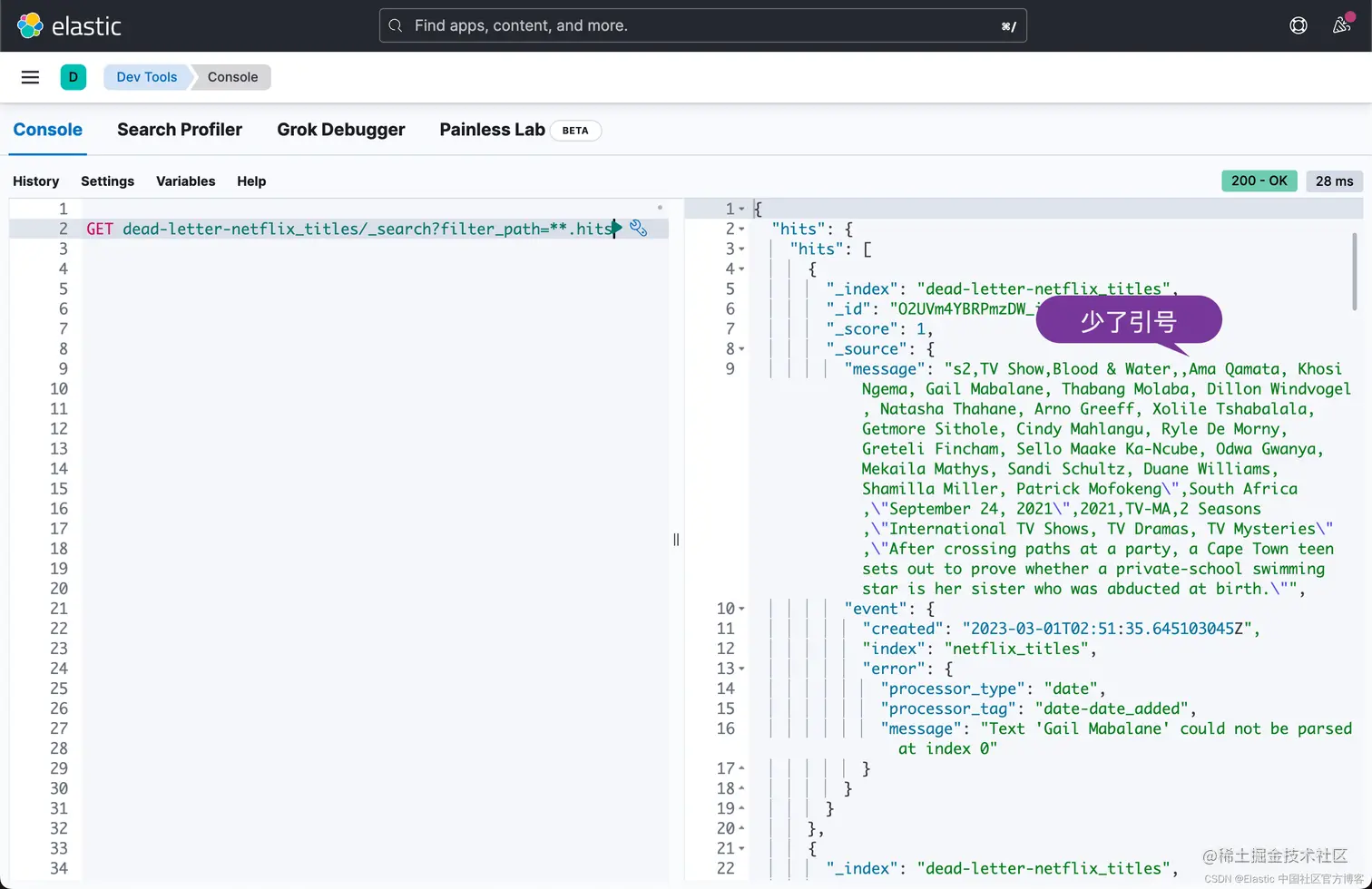 Hurray! 我们在 message 字段中获取原始消息,并在其他字段中获取错误的详细信息(csv 处理器因缺少引号而失败)。 我们可以看到最初的目标索引是 netflix_titles 并且我们在死信索引中也有该文档的创建日期。我们可以进一步查看其他文档的问题。
