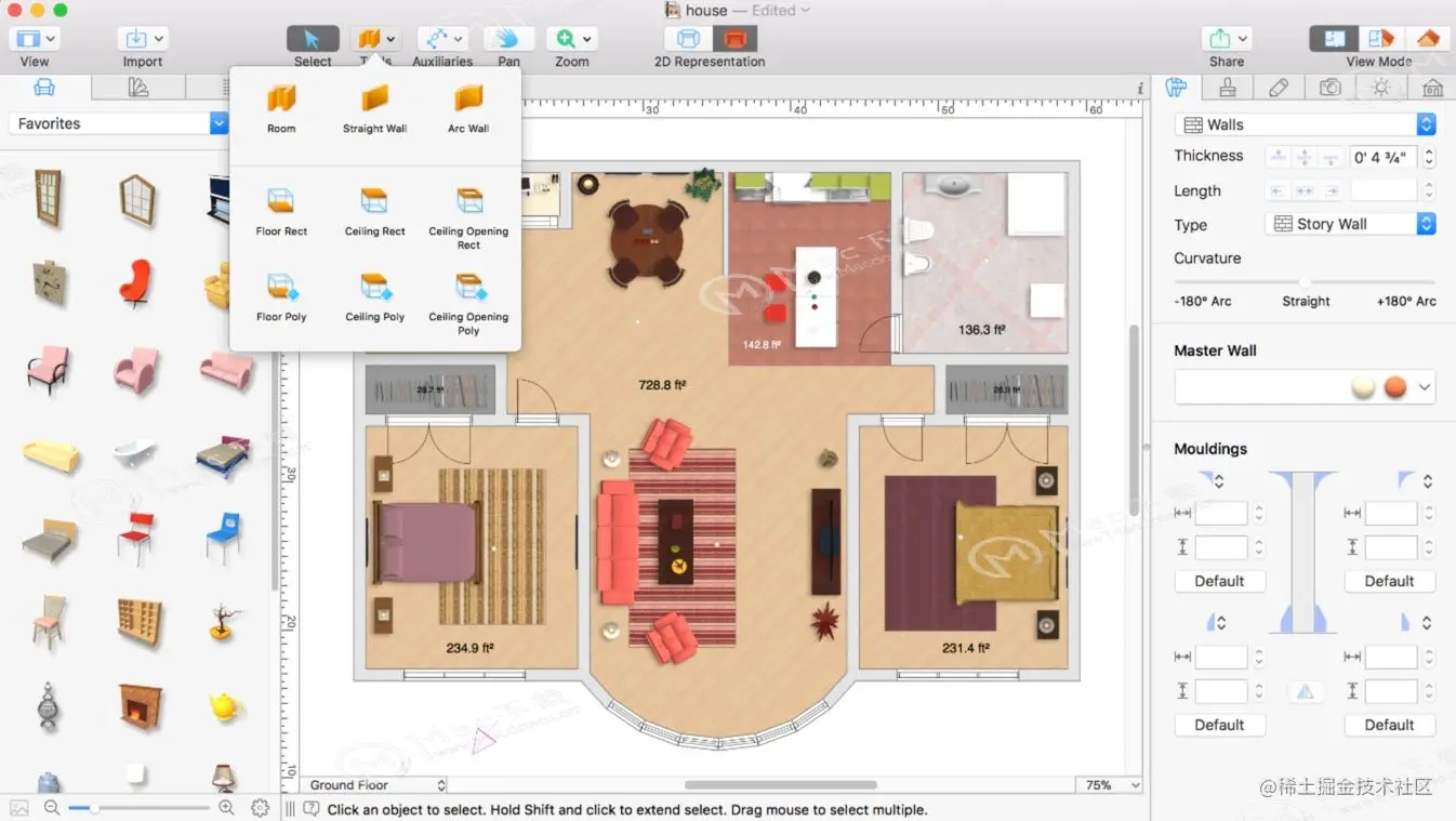 mac室内设计软件哪款好用?Live Home 3D 中文激活版通过使用直观的点击式绘图工具绘制2D平面图来启动室内设计项目,是个非常棒的选择! 只需点击几下即可测量房间和墙壁。添加家具,门窗。设置相机和电影轨道以拍摄室内设计视图。