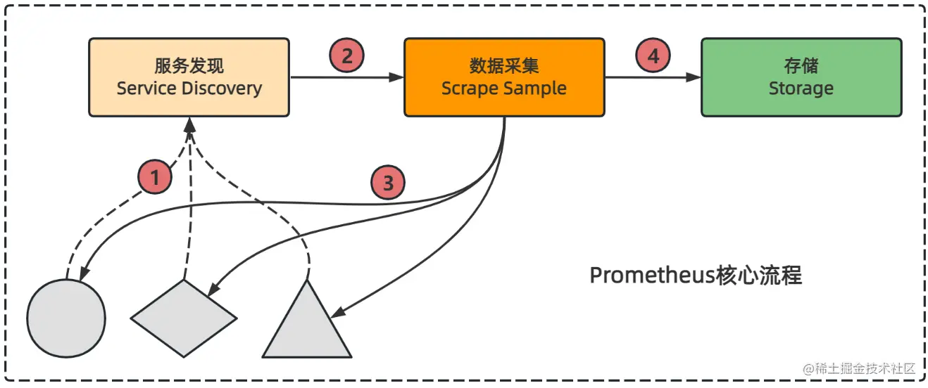 如上图,Prometheus核心功能包括服务发现、数据采集和数据存储。服务发现模块专门负责发现需要监控的目标采集点(target)信息,数据采集模块从服务发现模块订阅该信息,获取到target信息后,其中就包含协议(scheme)、主机地址:端口(instance)、请求路径(metrics_path)、请求参数(params)等;然后数据采集模块就可以基于这些信息构建出一个完整的Http Request请求,定时通过pull http协议不断的去目标采集点(target)拉取监控样本数据(sample);最后,将采集到监控样本数据交由TSDB模块进行数据存储。