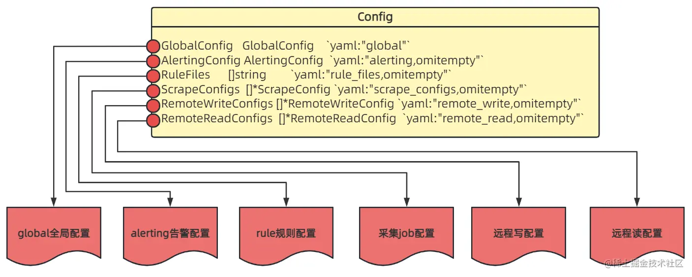 Config结构体是配置类的最顶层结构,内部包含6个字段分别对应prometheus配置的6大组成部分。❞