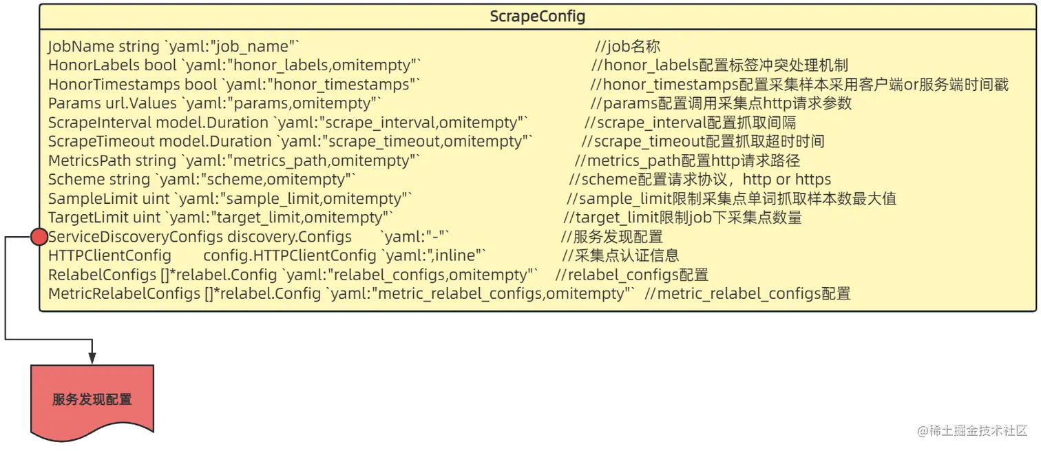 2、其中数据采集配置部分ScrapeConfigs对应的是一个*ScrapeConfig类型切片,一个ScrapeConfig对应的是scrape_configs配置下的一个job抓取任务,服务发现协议配置对应其中ServiceDiscoveryConfigs字段: