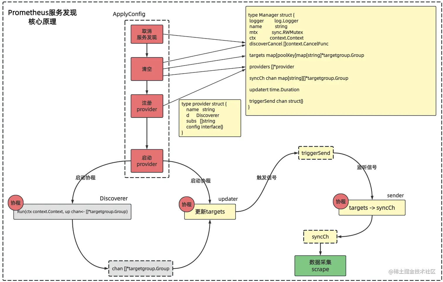 Prometheus服务发现核心逻辑的入口主要关注Manager结构体的ApplyConfig方法:基于服务发现的配置使其生效; -