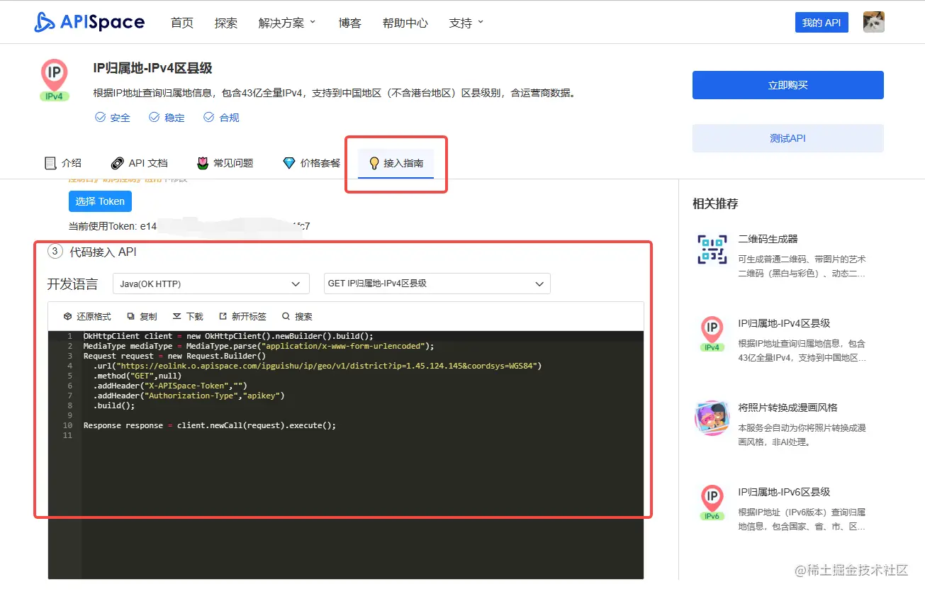 3.在详情页的接入指南tab中,APISpace 提供了各个开发语言的代码示例,复制粘贴接入代码即可使用~