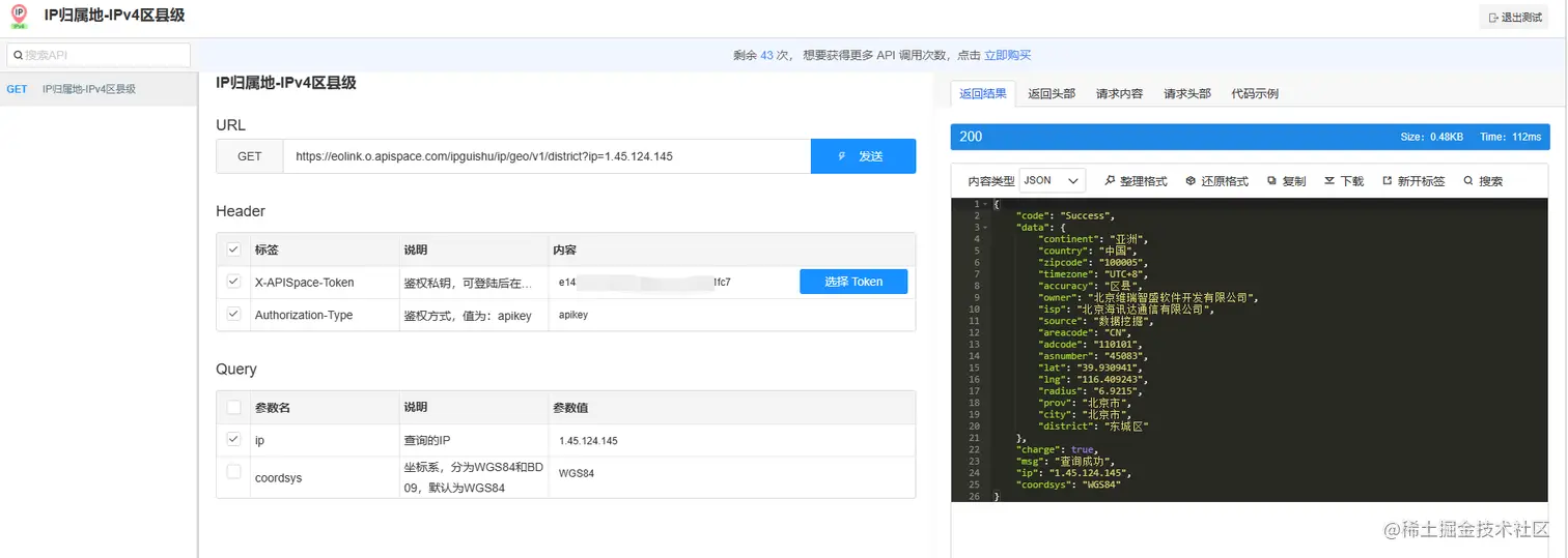 1.注册登录 APISpace,进入 IP归属地-IPv4区县级详情页,点击【免费试用】按钮即可领取免费次数
