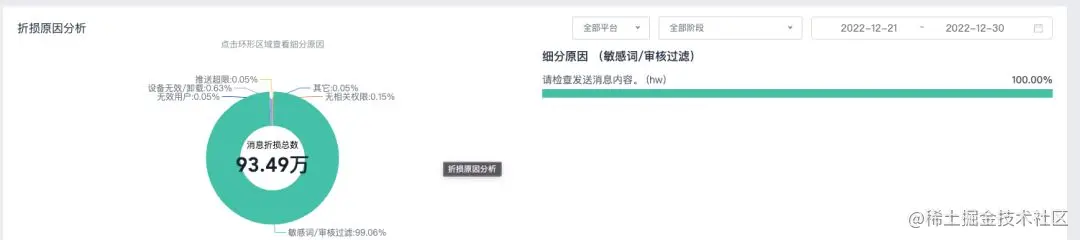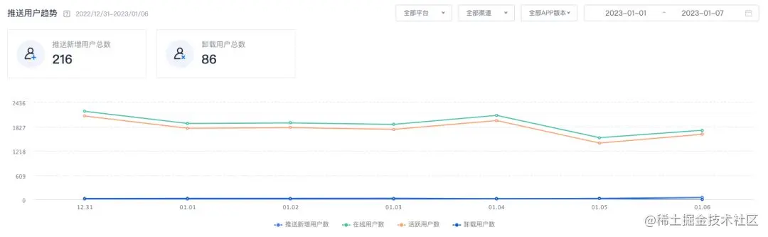 当完成一个消息推送时,极光提供专业的漏斗分析工具,向开发者提供推送耗时、推送结果分析;同时也有推送用户分析、推送消息统计分析等等工具,方便业务运营。