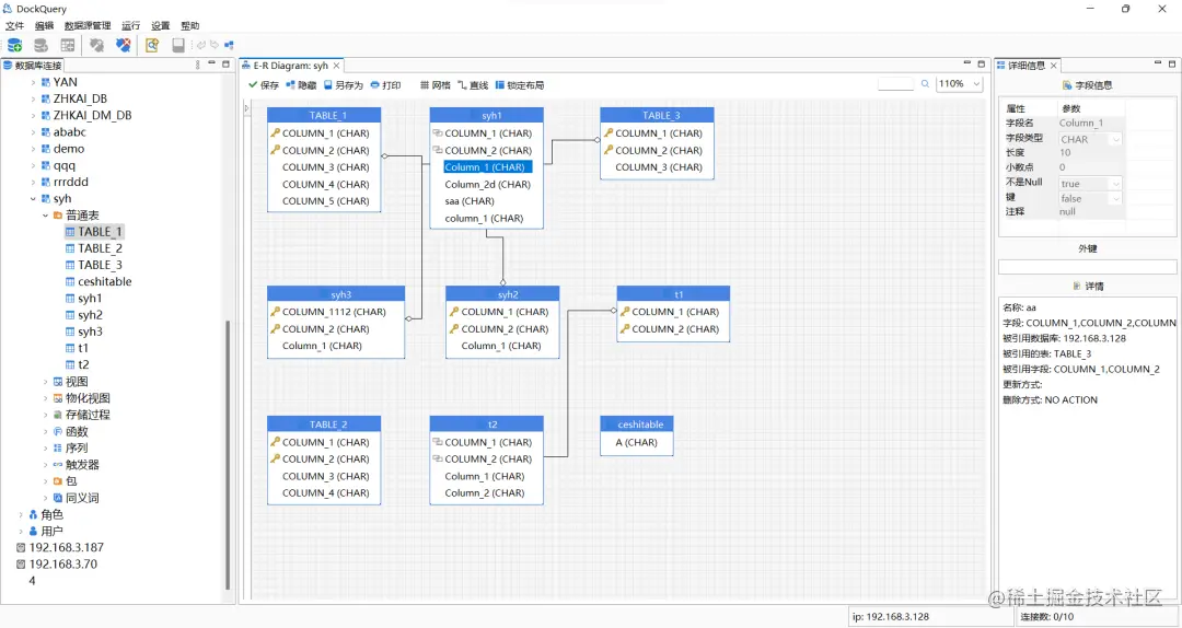 v1.2.0 增加了数据库ER图关系展示,支持动态生成数据库表与视图等对象关联关系生成ER关系图查看,主外键关系查看、手动布局\自动布局、支持导出、打印。