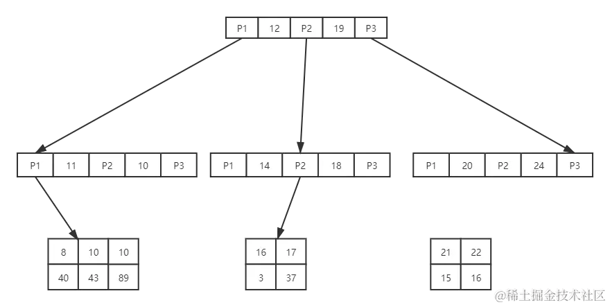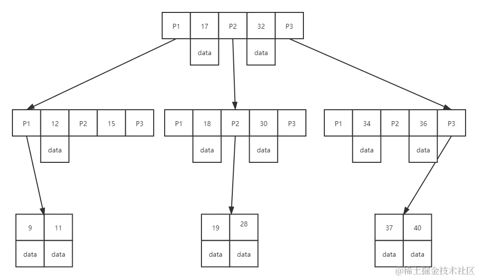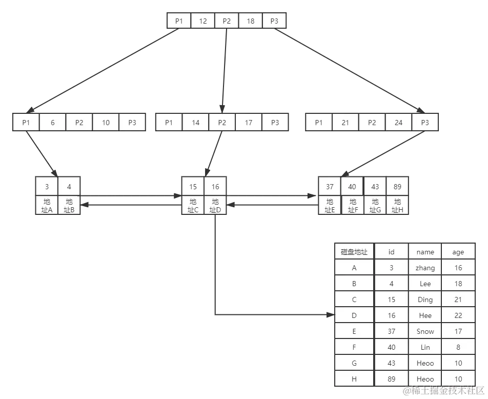 B-树的特点:1.每个节点存储多个元素 2.节点的元素包含键值以及数据 3.所有叶子节点存放同一层,具有相同深度,叶子节点之间没有指针连接。这种数据结构解决了树高IO次数多的问题,但是在每个节点存储数据,假设数据一旦很大,每个节点储存的索引数也随之减少,最后还是会导致树很高,查询效率低。其次,B-树不能范围查询。设想一下如果我们要查询15-25范围内的数据,查到15之后就又要重新回到根节点继续查找,这样循环遍历的效率有待提高。