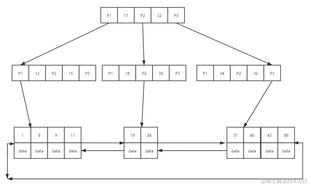 结合了B-树的缺点进行改造,就诞生了B+树。B+树跟B-树的差异并不是很大,判断的依据很简单:节点是否存放数据。B+树存放数据的节点只有叶子节点,而且叶子结点双向指针连接,形成了双向有序链表。