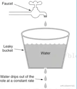 漏桶算法很形象,上面一个水龙头,水龙头可以调节大小,中间一个桶,桶下面有一个小孔,水从水龙头流入桶中,不管水龙头水流大小,往下滴的水滴速度是一定的。桶满了水溢出,说明请求被直接拒绝。