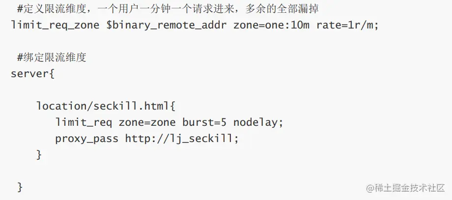 Nginx中使用ngx_http_limit_req_module模块来限制的访问频率,限制的原理实质是基于漏桶算法原理来实现的。在nginx.conf配置文件中可以使用limit_req_zone命令及limit_req命令限制单个IP的请求处理频率。