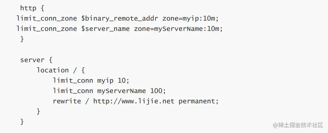上面配置了单个IP同时并发连接数最多只能10个连接,并且设置了整个虚拟服务器同时最大并发数最多只能100个链接。当然,只有当请求的header被服务器处理后,虚拟服务器的连接数才会计数。刚才有提到过Nginx是基于漏桶算法原理实现的,实际上限流一般都是基于漏桶算法和令牌桶算法实现的。