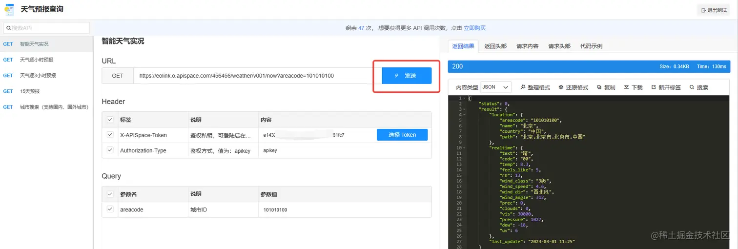 1.注册登录 APISpace,进入天气预报查询详情页,点击【免费试用】按钮即可领取免费次数