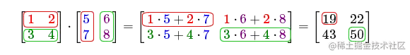 [ 1 2 3 4 ] ⋅ [ 5 6 7 8 ] = [ 1 ⋅ 5 + 2 ⋅ 7 1 ⋅ 6 + 2 ⋅ 8 3 ⋅ 5 + 4 ⋅ 7 3 ⋅ 6 + 4 ⋅ 8 ] = [ 19 22 43 50 ] \begin{bmatrix} \color{red}1 & \color{red}2 \\ \color{green}3 & \color{green}4 \end{bmatrix} \cdot \begin{bmatrix} \color{blue}5 & \color{purple}6 \\ \color{blue}7 & \color{purple}8 \end{bmatrix} = \begin{bmatrix} \color{red}1 \cdot \color{blue}5 + \color{red}2 \cdot \color{blue}7 & \color{red}1 \cdot \color{purple}6 + \color{red}2 \cdot \color{purple}8 \\ \color{green}3 \cdot \color{blue}5 + \color{green}4 \cdot \color{blue}7 & \color{green}3 \cdot \color{purple}6 + \color{green}4 \cdot \color{purple}8 \end{bmatrix} = \begin{bmatrix} 19 & 22 \\ 43 & 50 \end{bmatrix} [ 1 3 2 4 ] ⋅ [ 5 7 6 8 ] = [ 1 ⋅ 5 + 2 ⋅ 7 3 ⋅ 5 + 4 ⋅ 7 1 ⋅ 6 + 2 ⋅ 8 3 ⋅ 6 + 4 ⋅ 8 ] = [ 19 43 22 50 ]