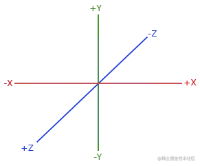 按照惯例,OpenGL是一个右手坐标系。简单来说,就是正x轴在你的右手边,正y轴朝上,而正z轴是朝向后方的。想象你的屏幕处于三个轴的中心,则正z轴穿过你的屏幕朝向你。坐标系画起来如下: