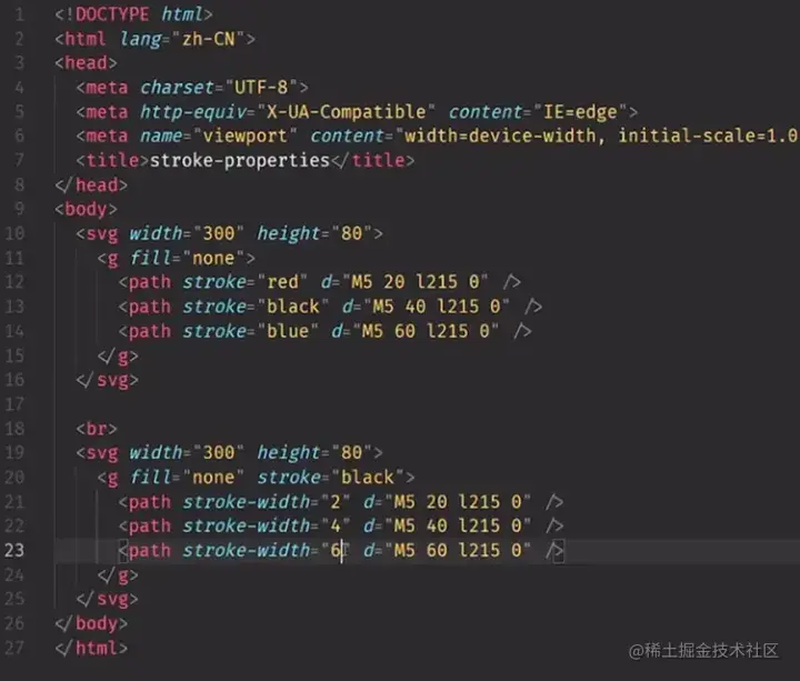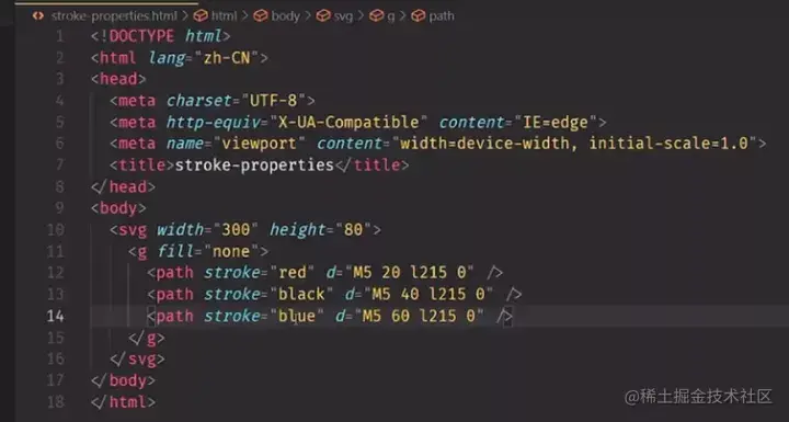 打开编辑器,新建一个 stroke-properties.html 文件,补全基础代码,在 body 里添加一个 svg 标签,定义属性 width 等于 300,height 等于 80。