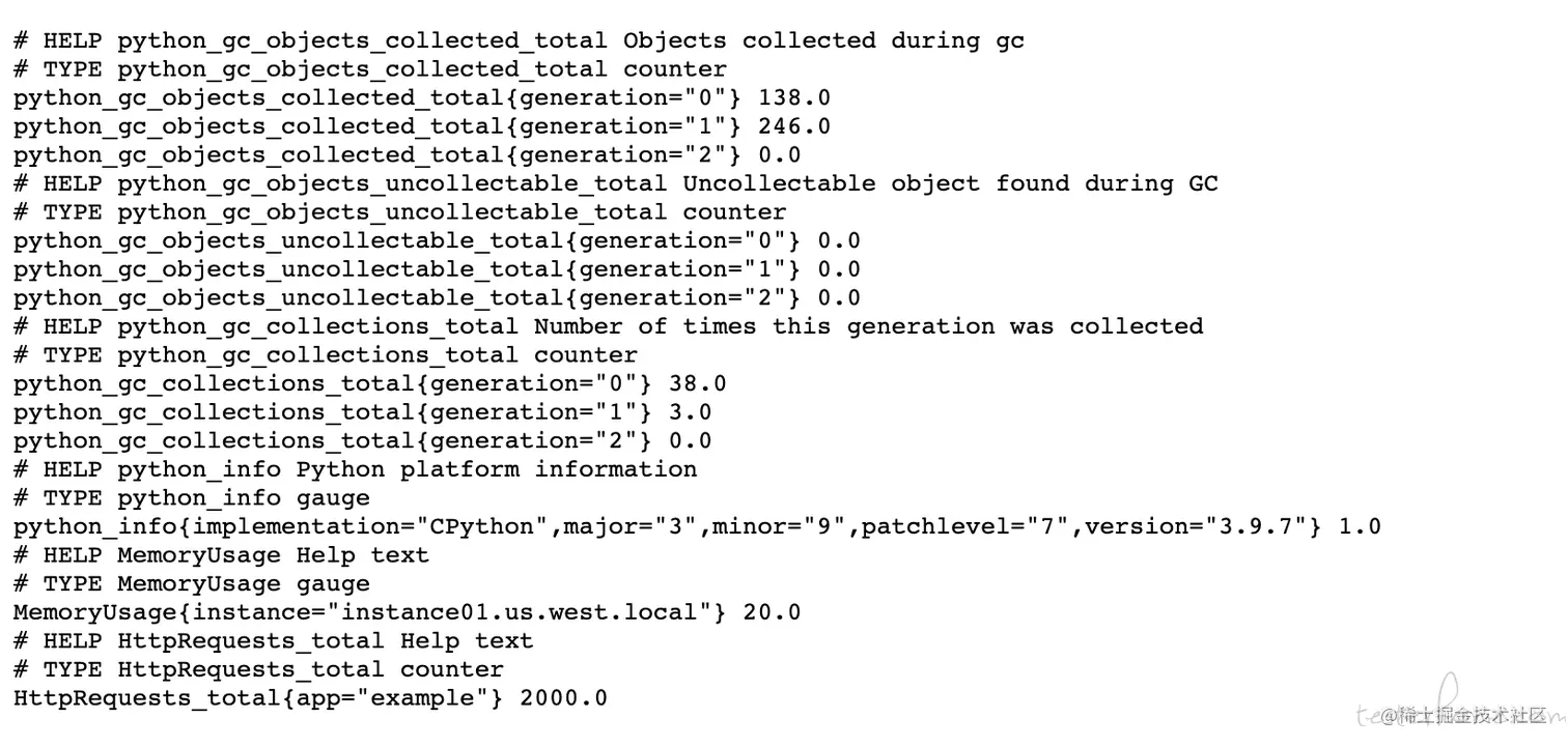 其中 # 开头的是某个或者某些指标的帮助文档, 而非 # 开头的每一行表示当前 Exporter 采集到的一个监控样本。由于我是使用普罗米修斯的 python client 编写的 exporter, 所以它自带了 python 的多个监控指标。 而下面的MemoryUsage 和HttpRequests 就是我自己定义的监控指标了。 这其中MemoryUsage 和HttpRequests 是指标名称, 花括号内的是这个指标的 label, label 是个非常重要的机制, 它把相同的监控指标按自定义的 label 类型进行分类,比如这个监控数据是哪个机器的, 哪个机房的等等。 是编写 exporter 的人定义上去的, 目的是在后续使用 PromQL 的时候用户可以用 label 把监控数据进行分类查询 。 比如用户想要抓取每台机器上的 CPU Load 数据,分别显示出来 。 那它就要在查询 cpu_load15 的时候用 label 进行分组了。 最后面的浮点数值就是监控数据的值了。