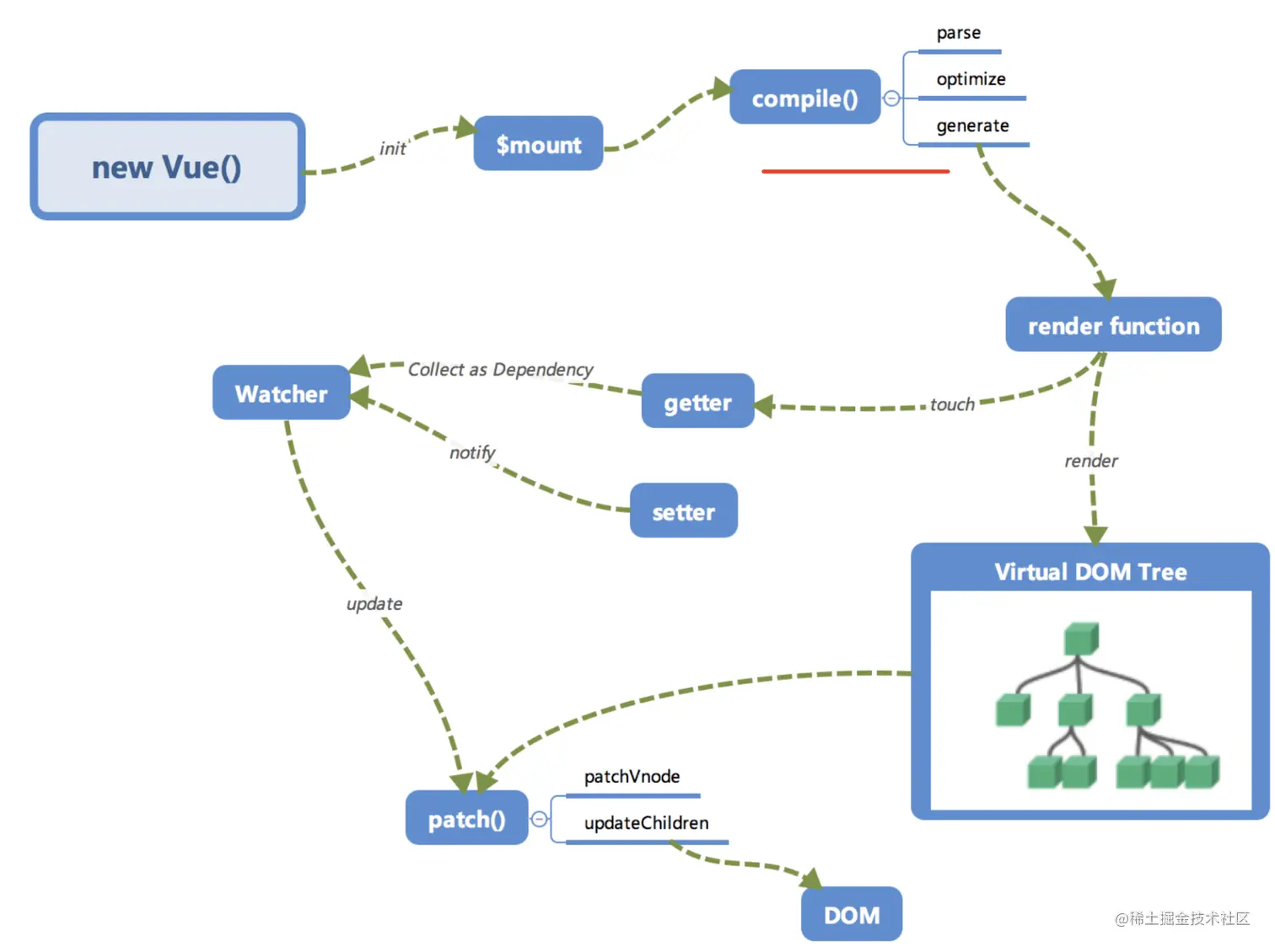 watcher就会调用patch给真实的DOM打补丁 - 通过