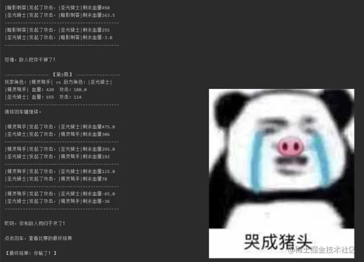 return 1, result # 返回元组(1,'\n敌人死翘翘了,你赢了!'),类似角色属性的传递。