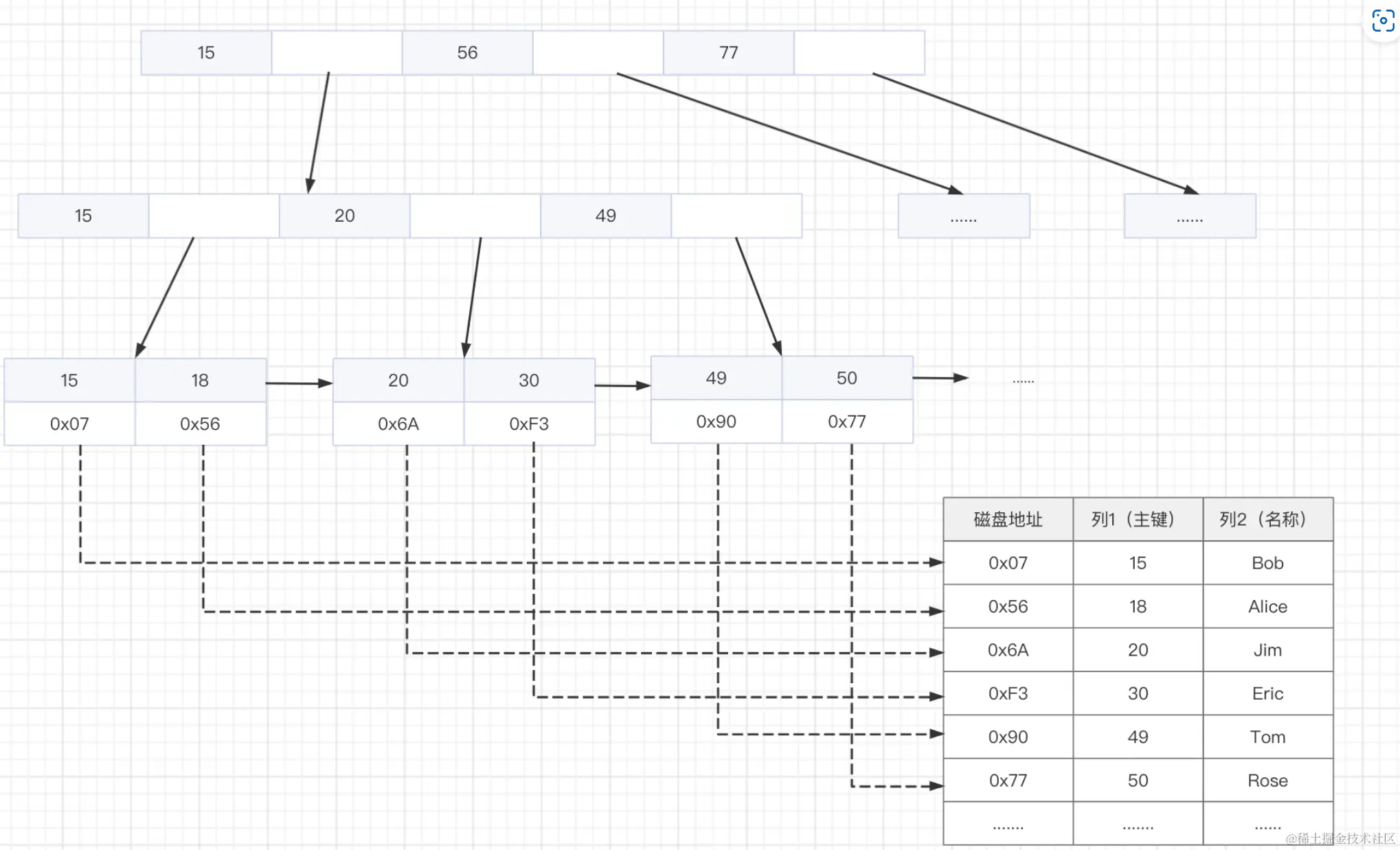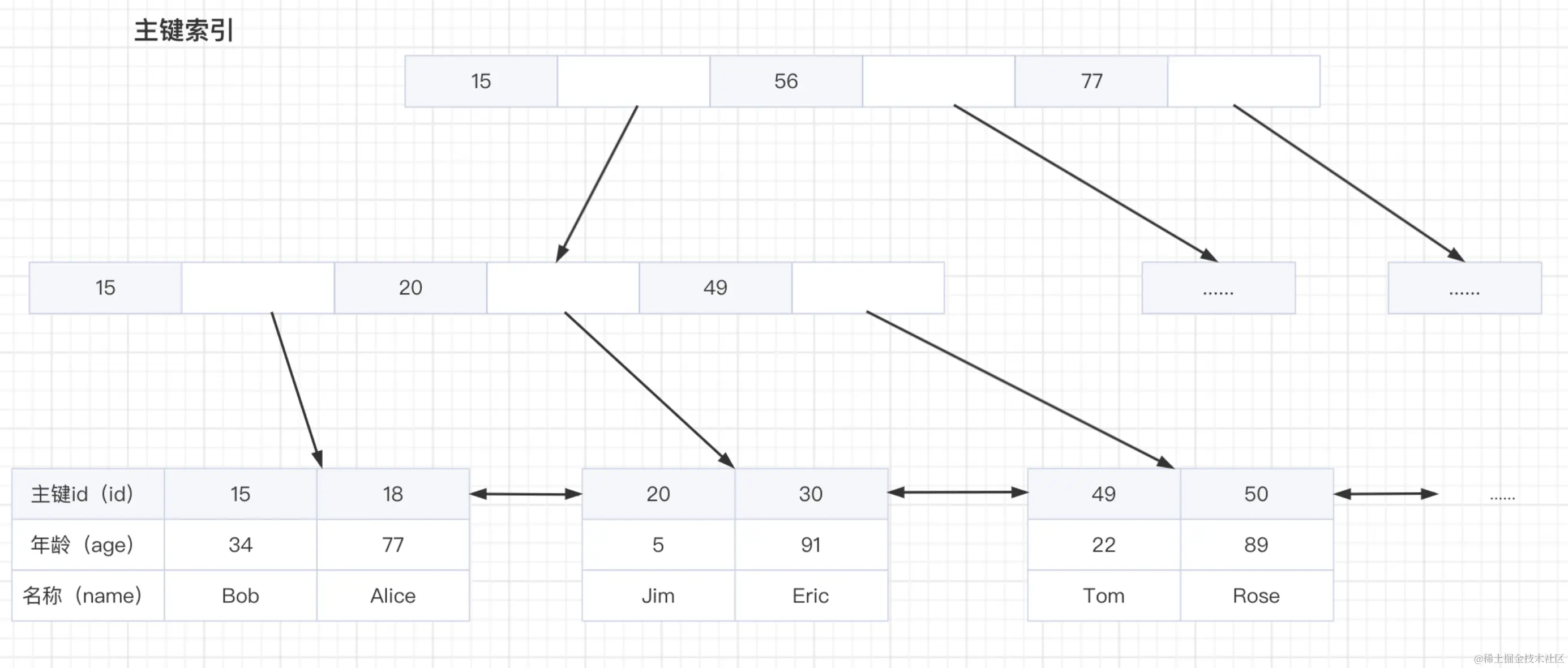 - 进行比对,找到key=Alice索引元素,其对应的存储了该行数据的主键id