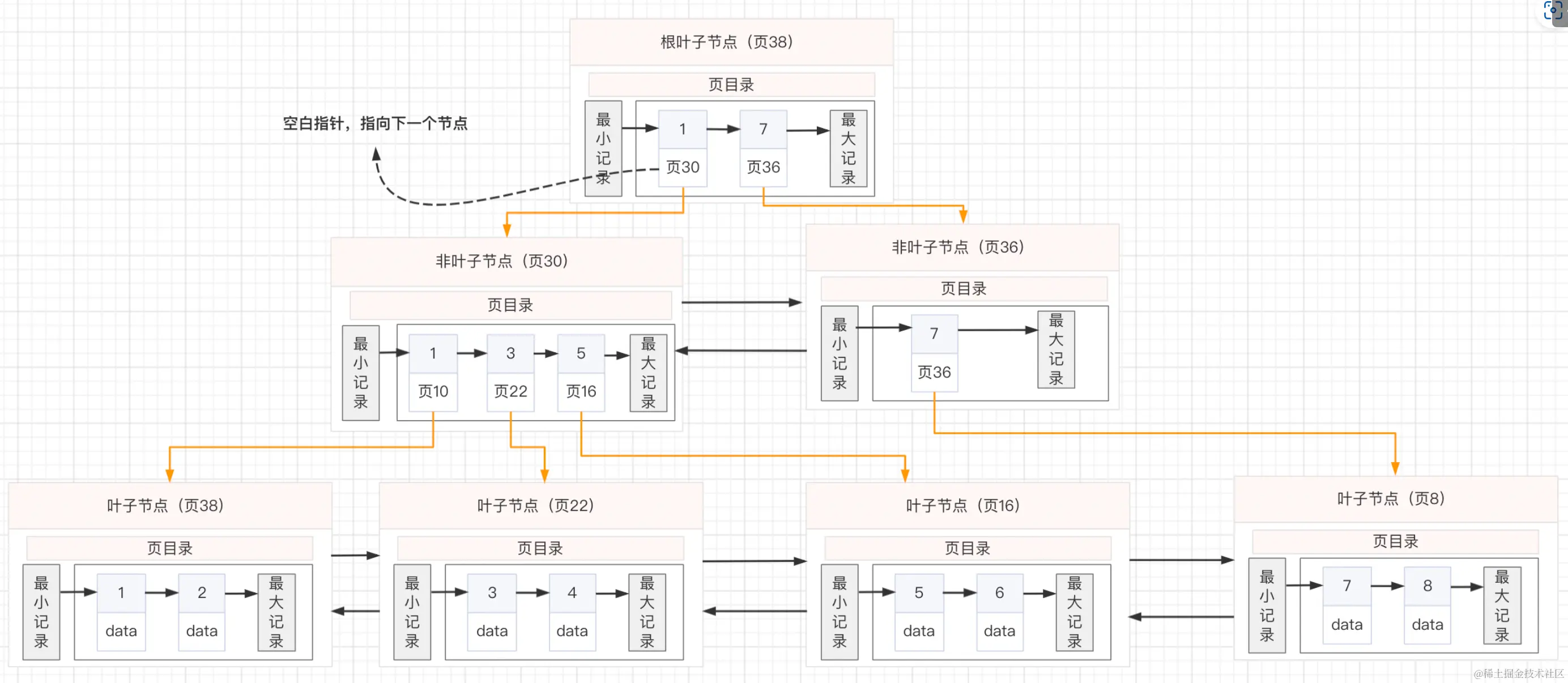 我们知道一个索引页存储多个记录,那么多个行记录如何进行关联的呢? 索引页之间通过上一个页、下一个页建立一个双向链表把许许多多的页就串联起来, 而无需这些页在物理上真正连续。