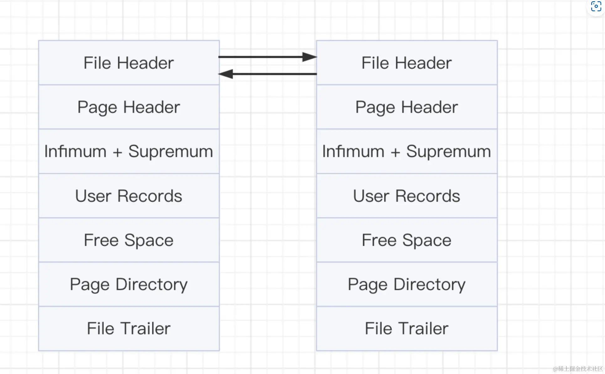 - 索引页的构成包含了File Header(文件头头部)记录了上下索引的前后指针。