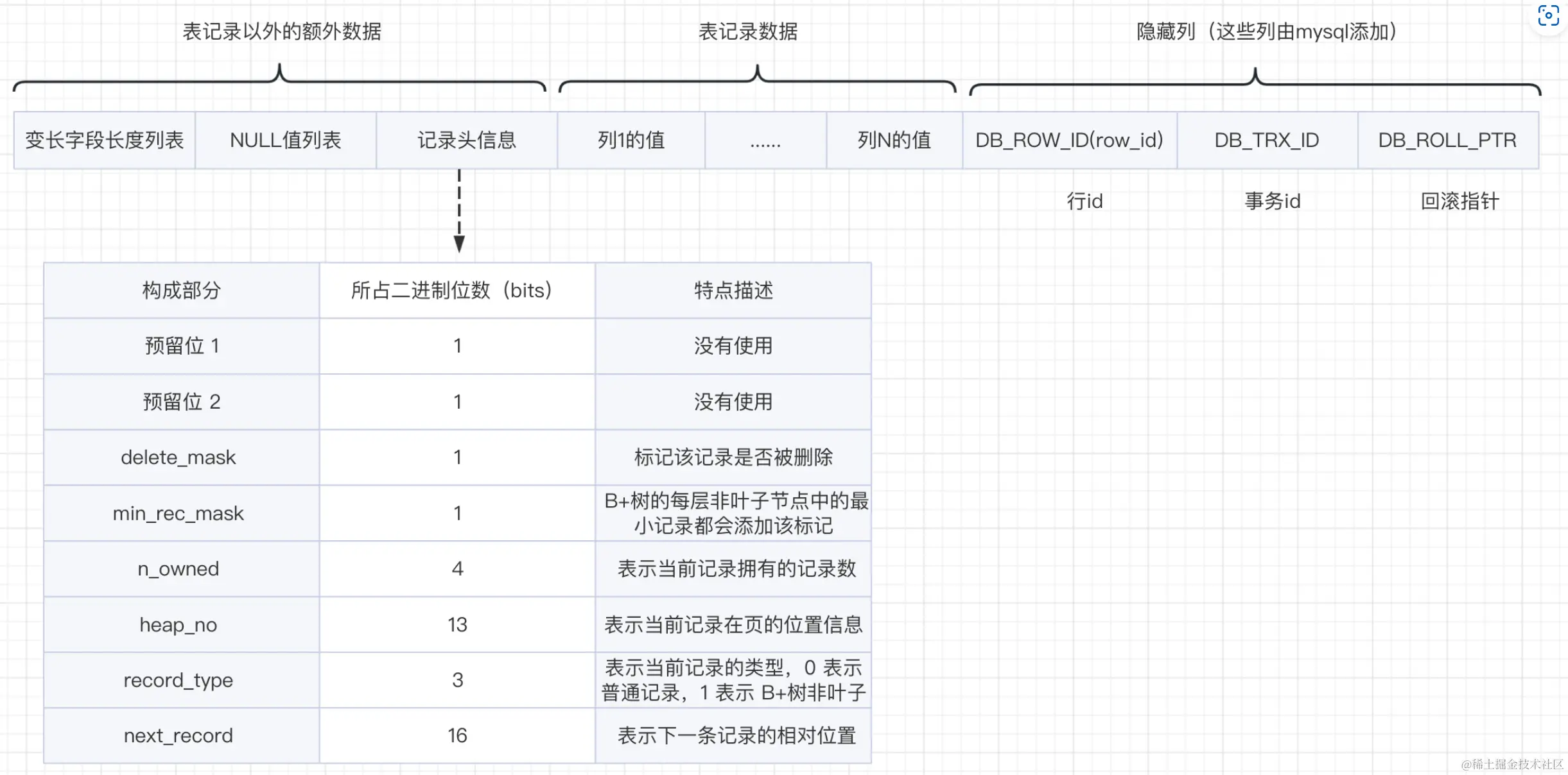 - innodb默认的行格式为Dynamic,每一条行记录的格式包含了记录头的信息,记录头信息包含了n_ownd(当前拥有的记录数),next_record(指向下一跳记录的相对位置)。