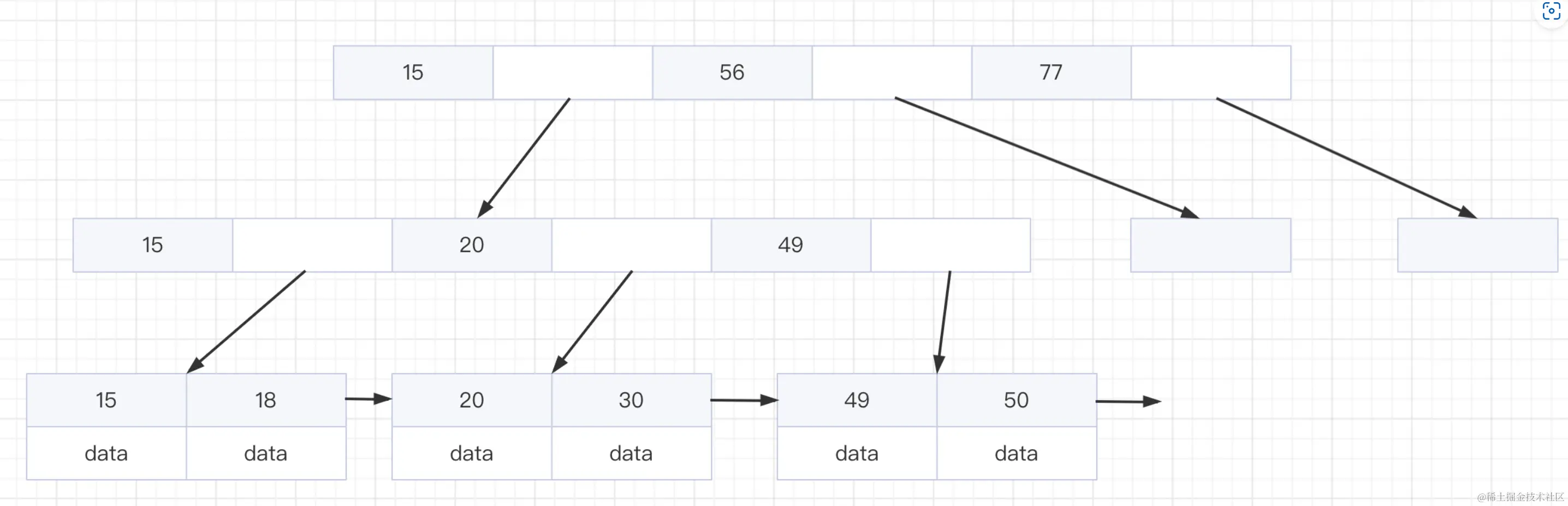 对比B-Tree而言,B+Tree则是它的加强版本,其非叶子节点不存储data,只存储冗余的索引,这样子一个节点就可以放更多的索引。