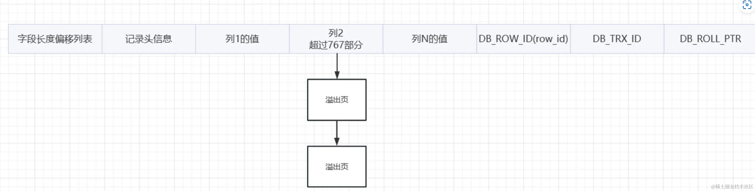 - 因为数据溢出,当前页的行记录某列数据存储指针指向别的页进行了存储,这样会导致多些磁盘I/O。