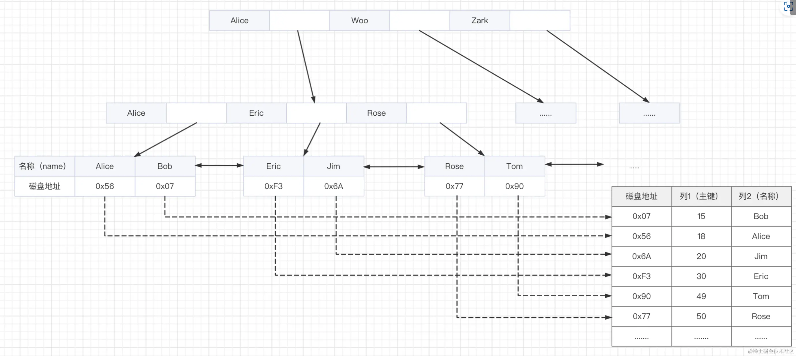 - 建立了索引则根据值Alice去根节点去查找,根节点是常驻内存的,一直往下找