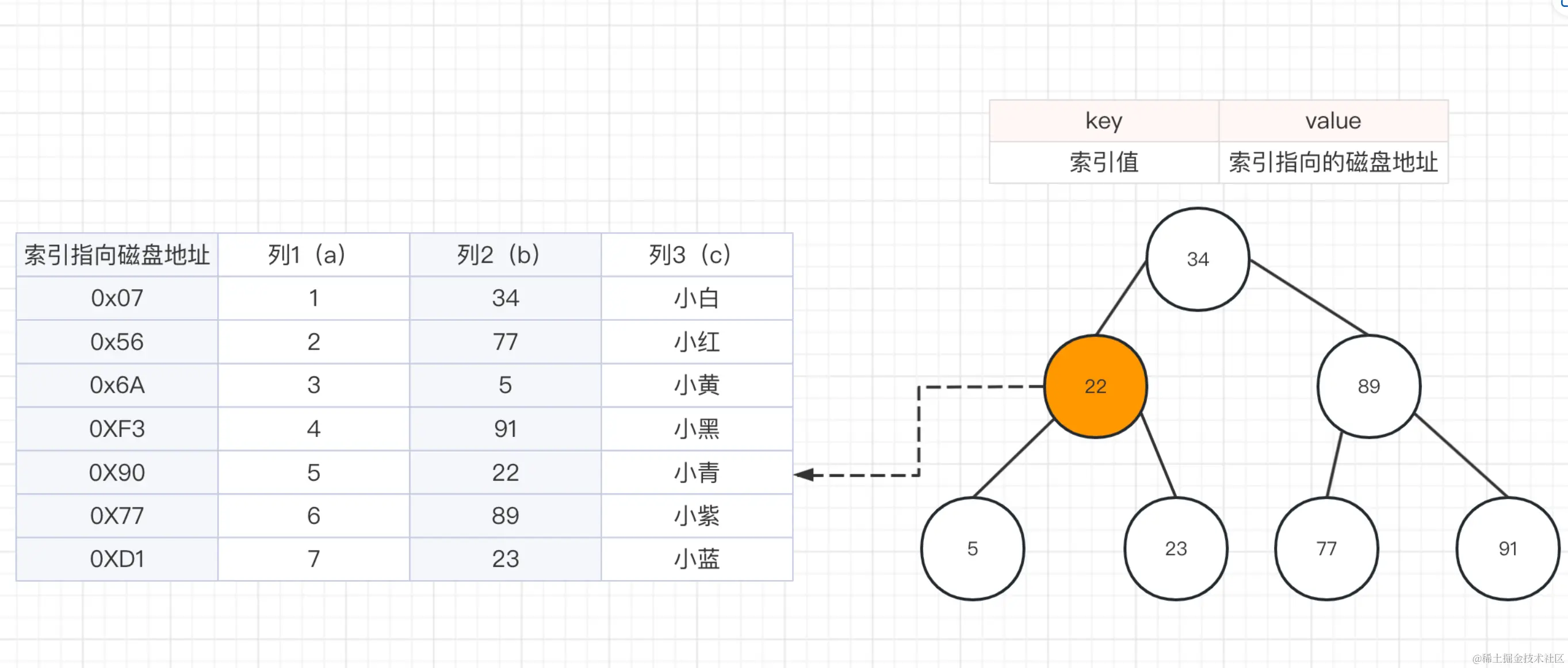 下面我们用较为简单的二叉树来体验一下索引是如何高效的查找mysql表数据的? 其中二叉树的节点结构为key和value两个属性,key为字段的数值,value为索引指向的磁盘地址文件指针 当前执行select * from temp where b = 22:
