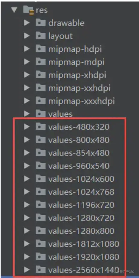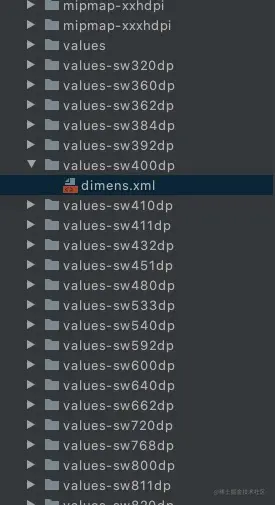 屏幕限定符适配,是针对不同屏幕的分辨率创建values-xxx的文件夹,在遇到对应的屏幕分辨率时就可以找到对应的values文件夹,查找文件夹下的dimens.xml文件,确定每个屏幕尺寸下显示控件的大小。如下图: