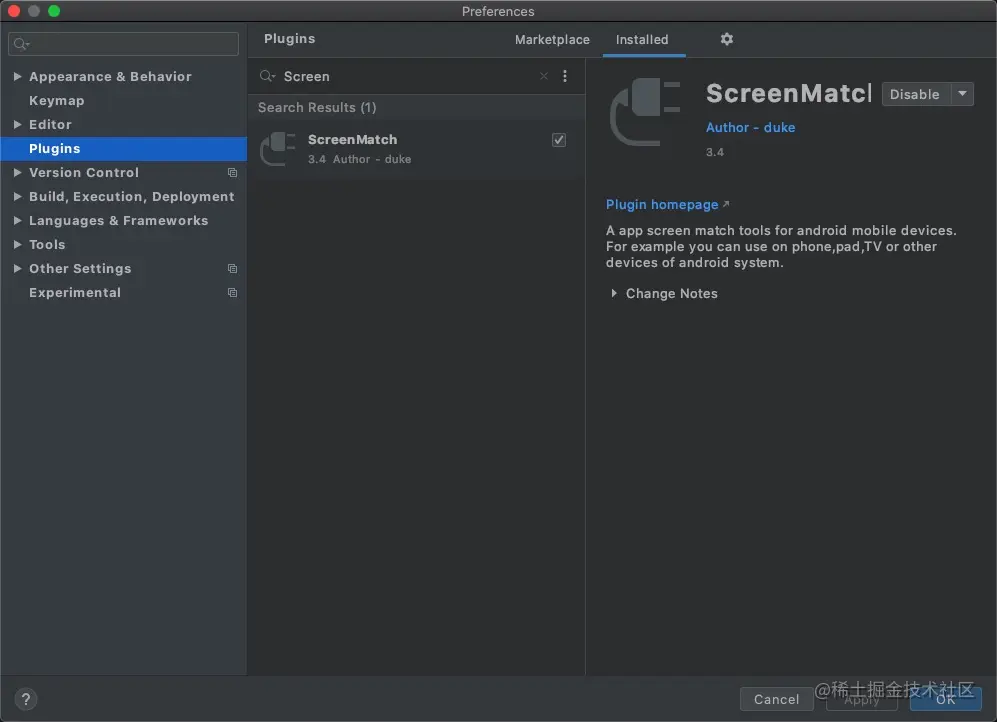在MarketPlace中找到ScreenMatch点击安装即可。