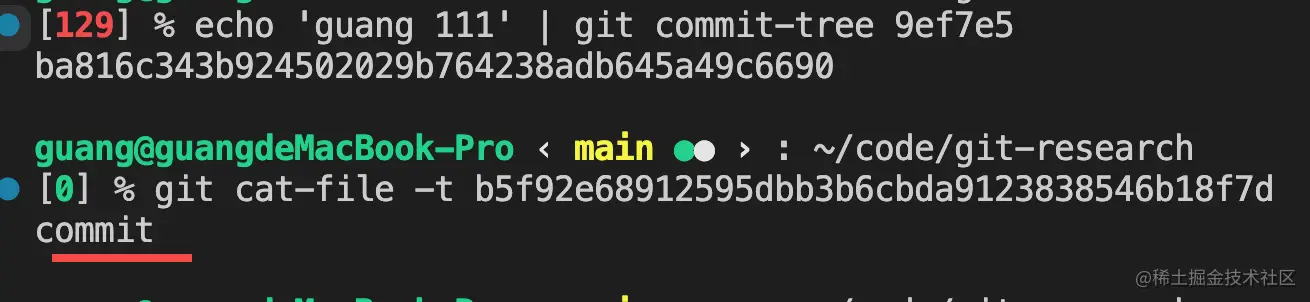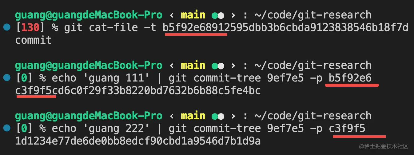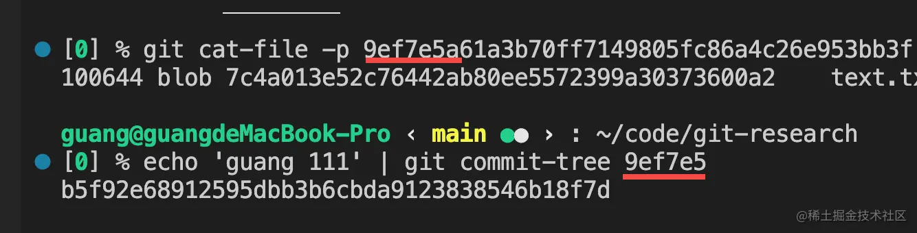 echo 'guang 111' | git commit-tree 9ef7e5 -p b5f92e6