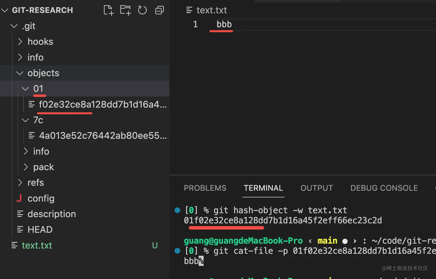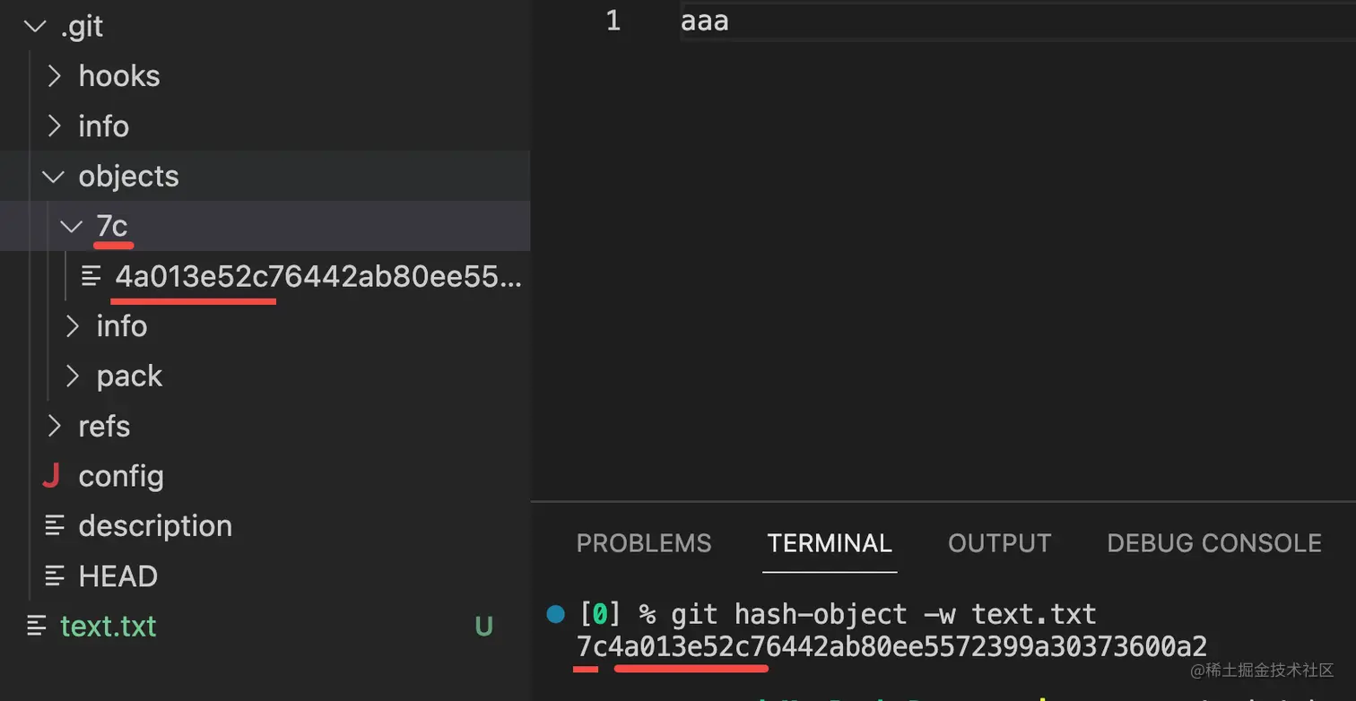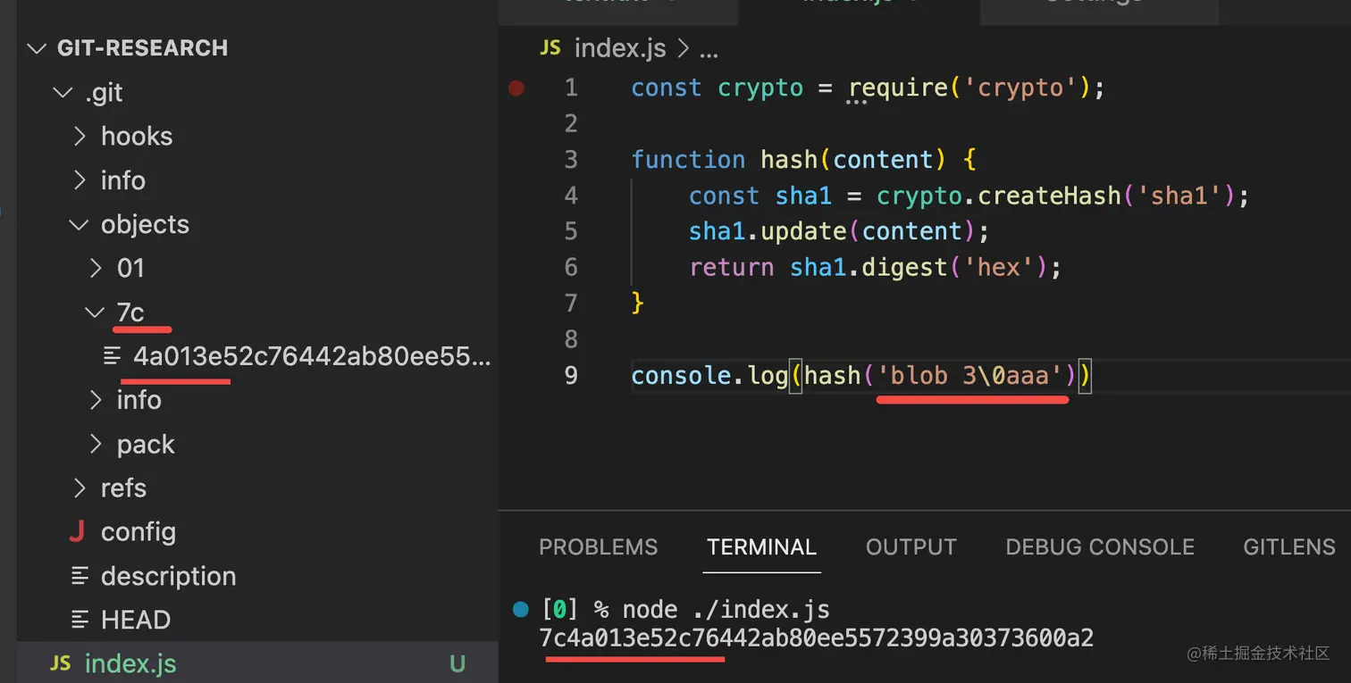 还有,hash 的计算方式是类似 blob 3\0aaa 这样 “对象类型 内容长度\0内容”的格式,对它做 sha1 然后转为十六进制。