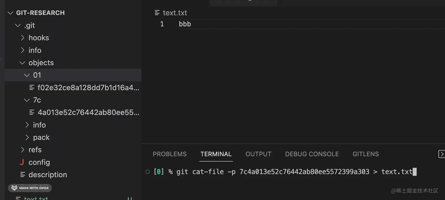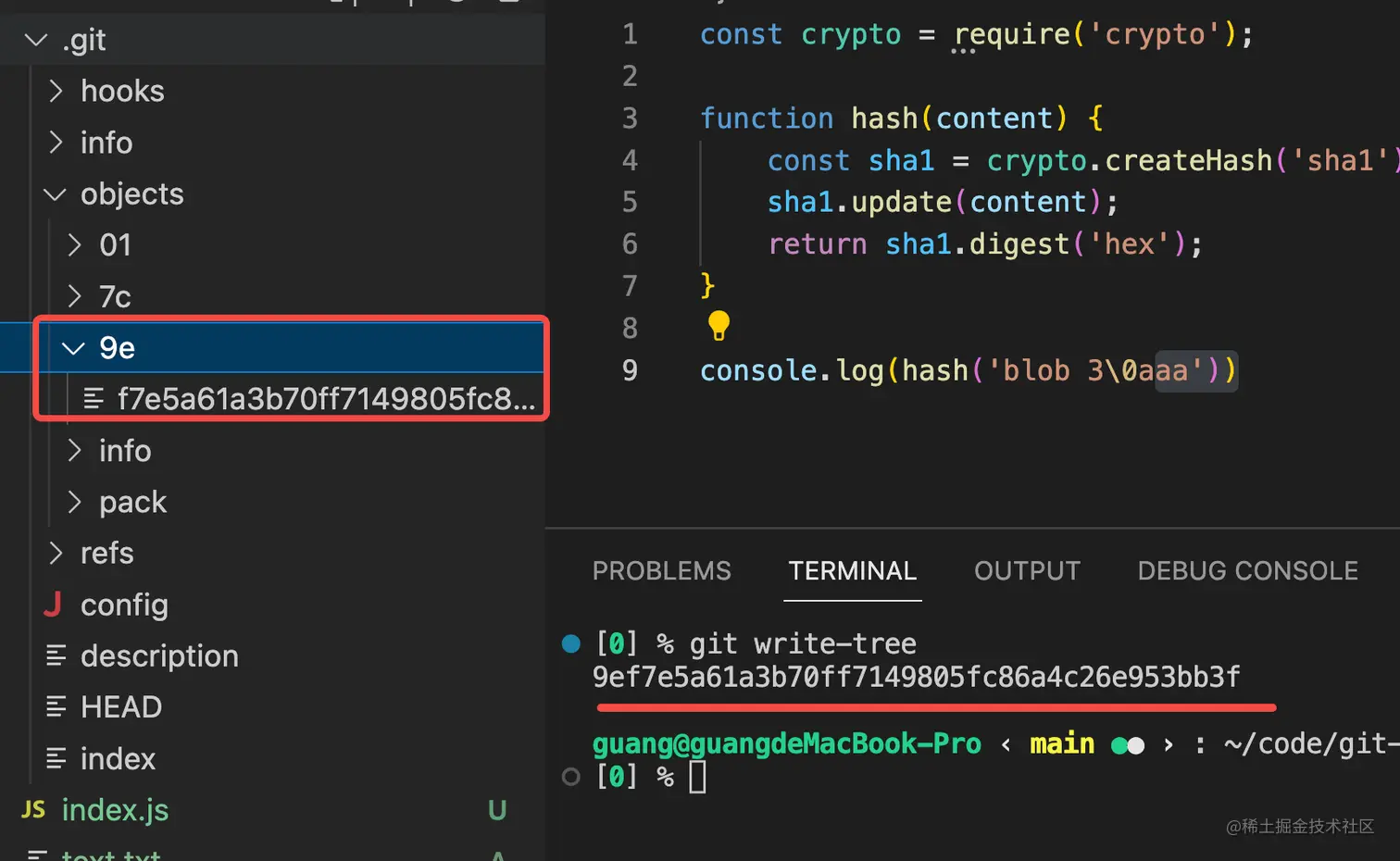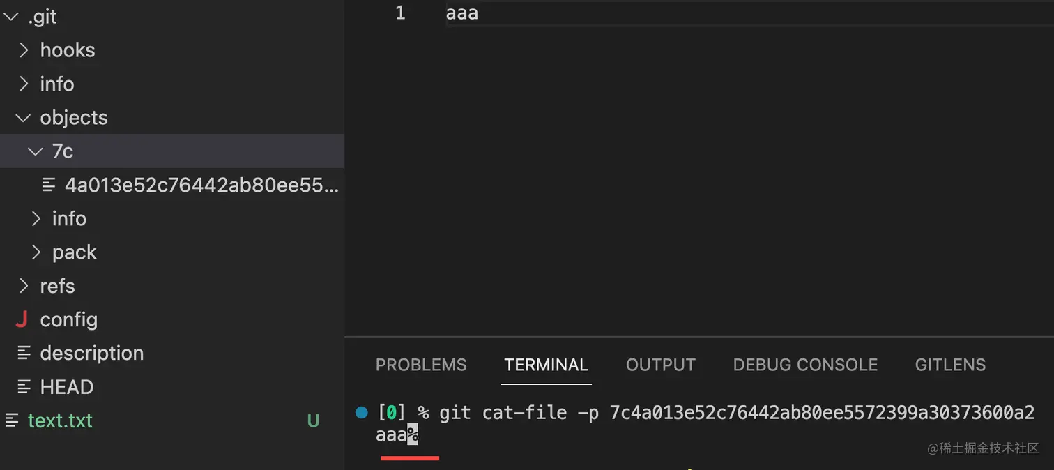还有,hash 的计算方式是类似 blob 3\0aaa 这样 “对象类型 内容长度\0内容”的格式,对它做 sha1 然后转为十六进制。