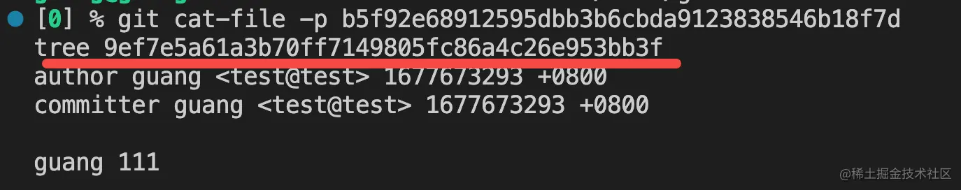 下面的内容很熟悉,但是多了一个 tree 节点的指向,这个很正常,commit 的内容就是某个 tree 所对应的版本嘛。