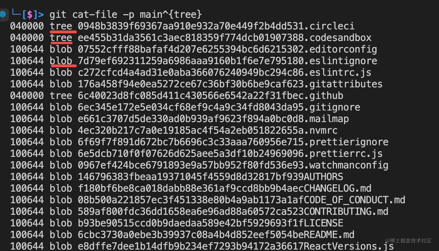 比如我在 react 项目下执行了 cat-file,之前我们用它查看过 blob 对象内容,这次查看的是 main 分支的顶部的 tree 对象。