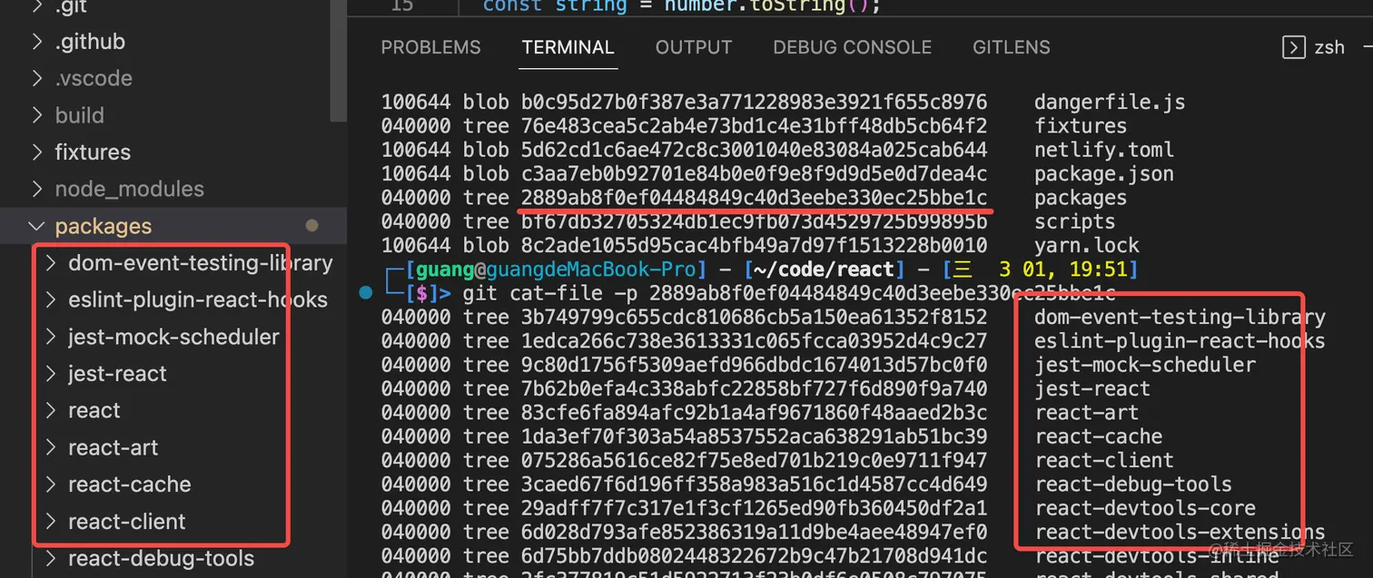 我们继续用 cat-file 看下 packages 这个 tree 对象的内容: