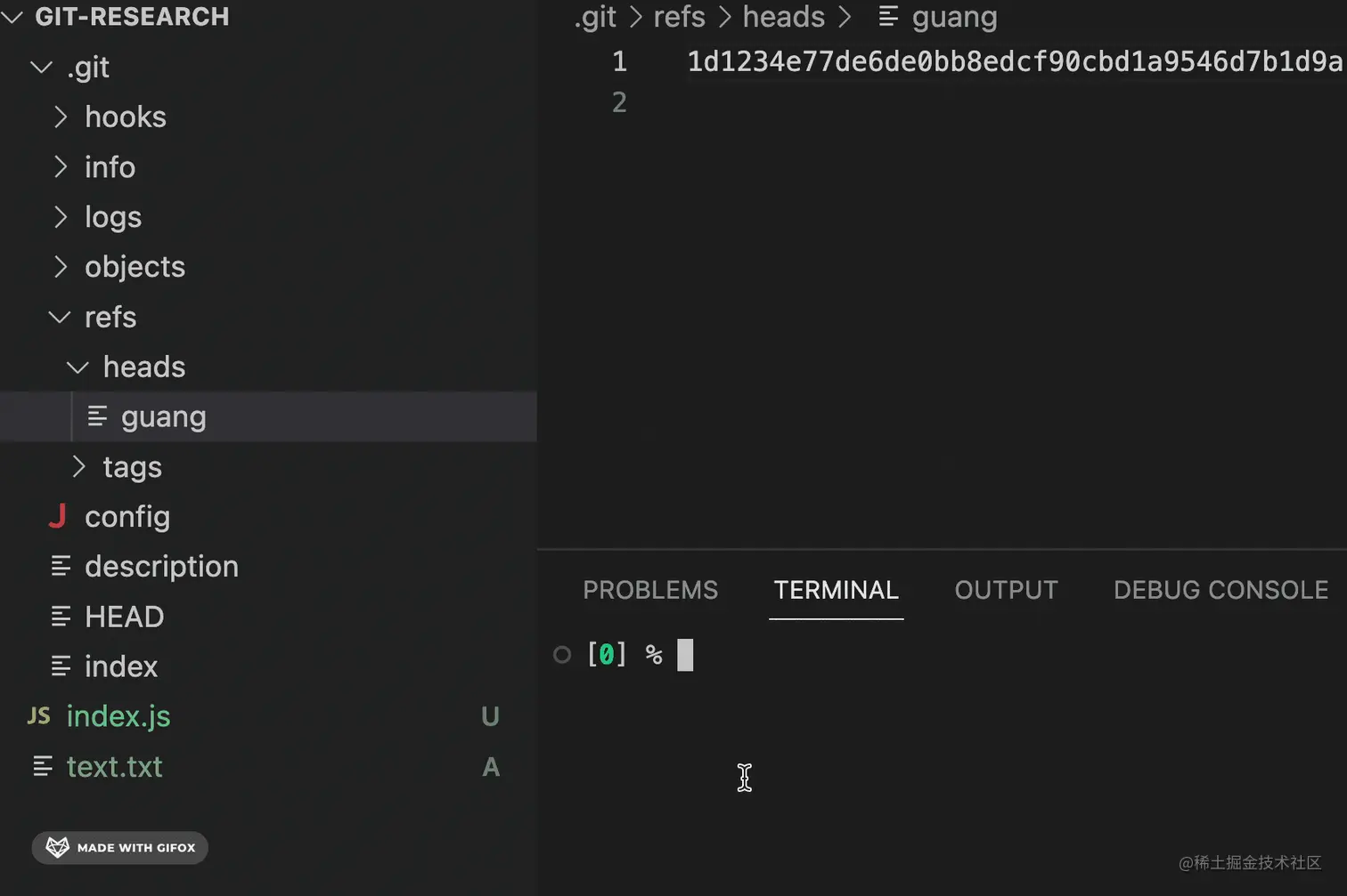 这里就会多一个文件,内容存着指向的 commit 是啥: