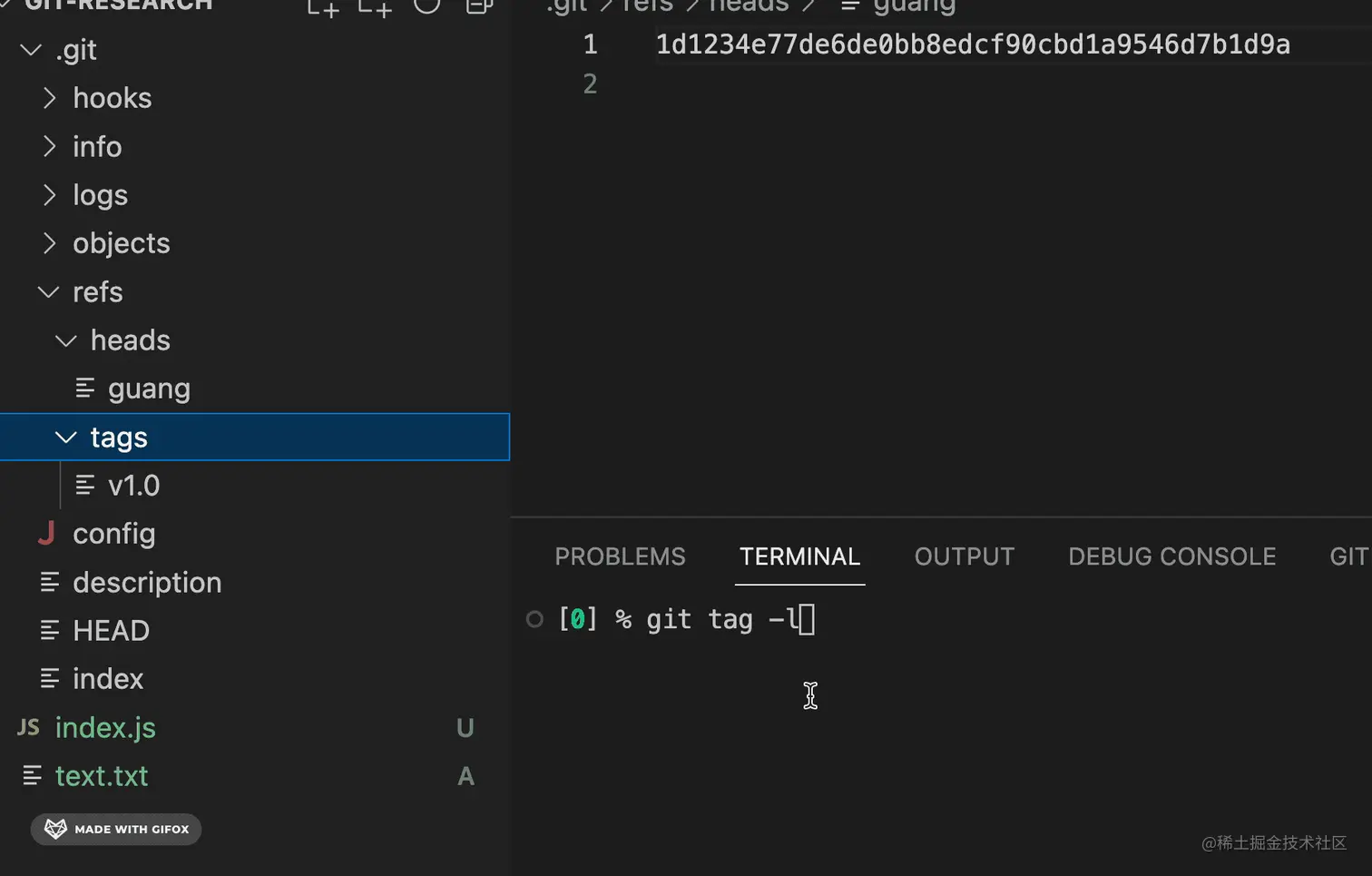 比如我创建了一个叫做 guang 的指向一个 commmit 对象的 ref。