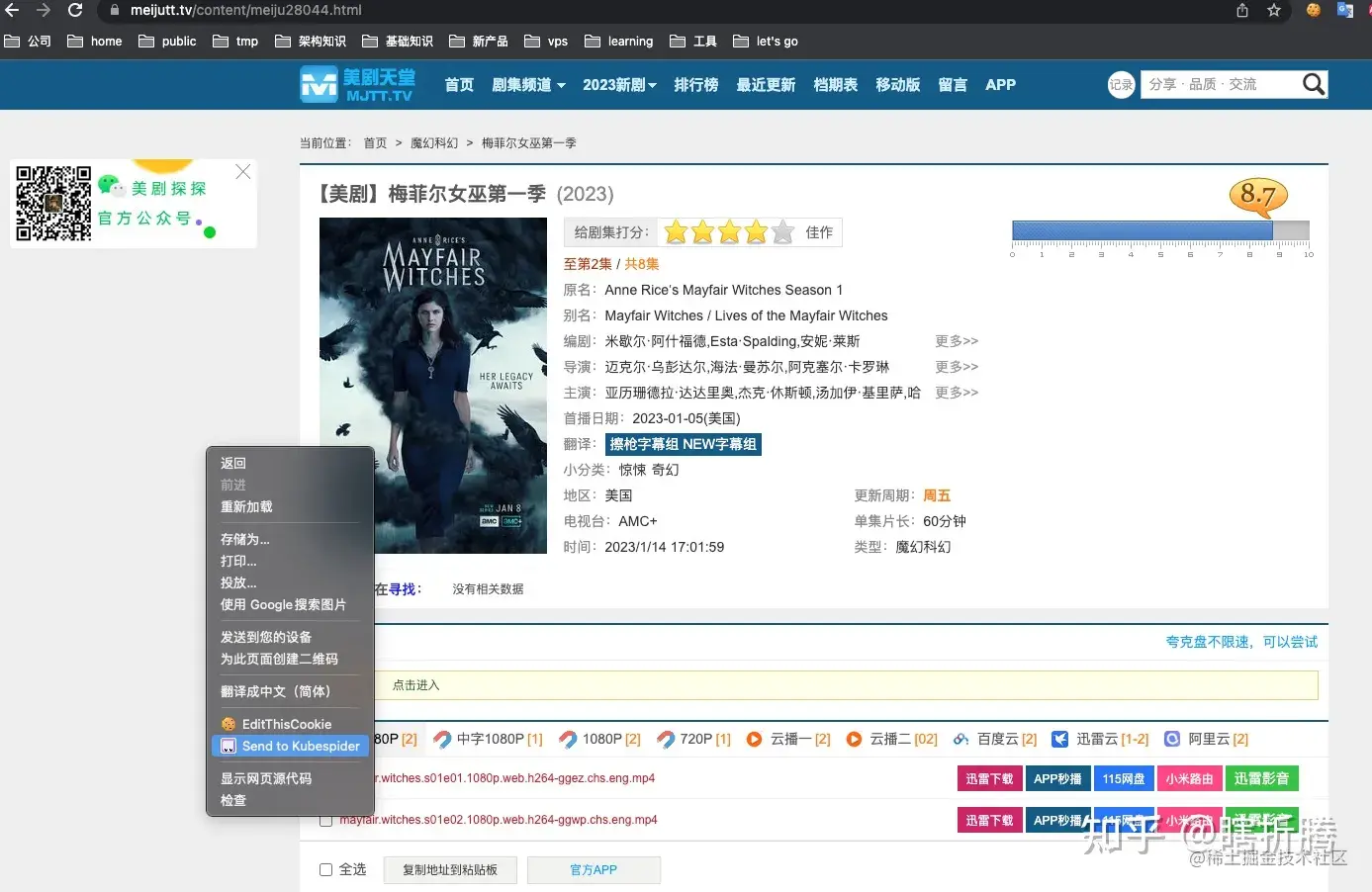 最后的使用效果非常不错,示例如下,右键鼠标,Kubespider在服务器上接收触发,即可下载已有剧集并追更,也可以根据bt连接下载资源,下载通用文件(iso镜像等),你也可以自定义丰富资源下载场景。