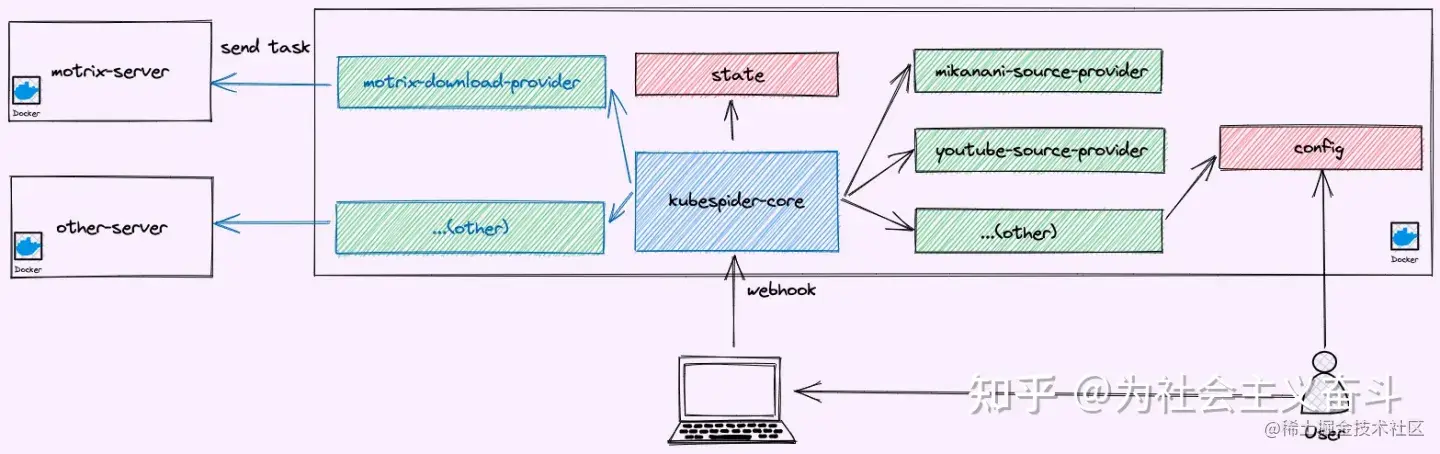 可以看如下架构图,Kubespider是作为一个在下载软件和资源网站的中间层,在不同场景特定条件下,从资源网站获取链接,调用不同的下载软件下载资源: