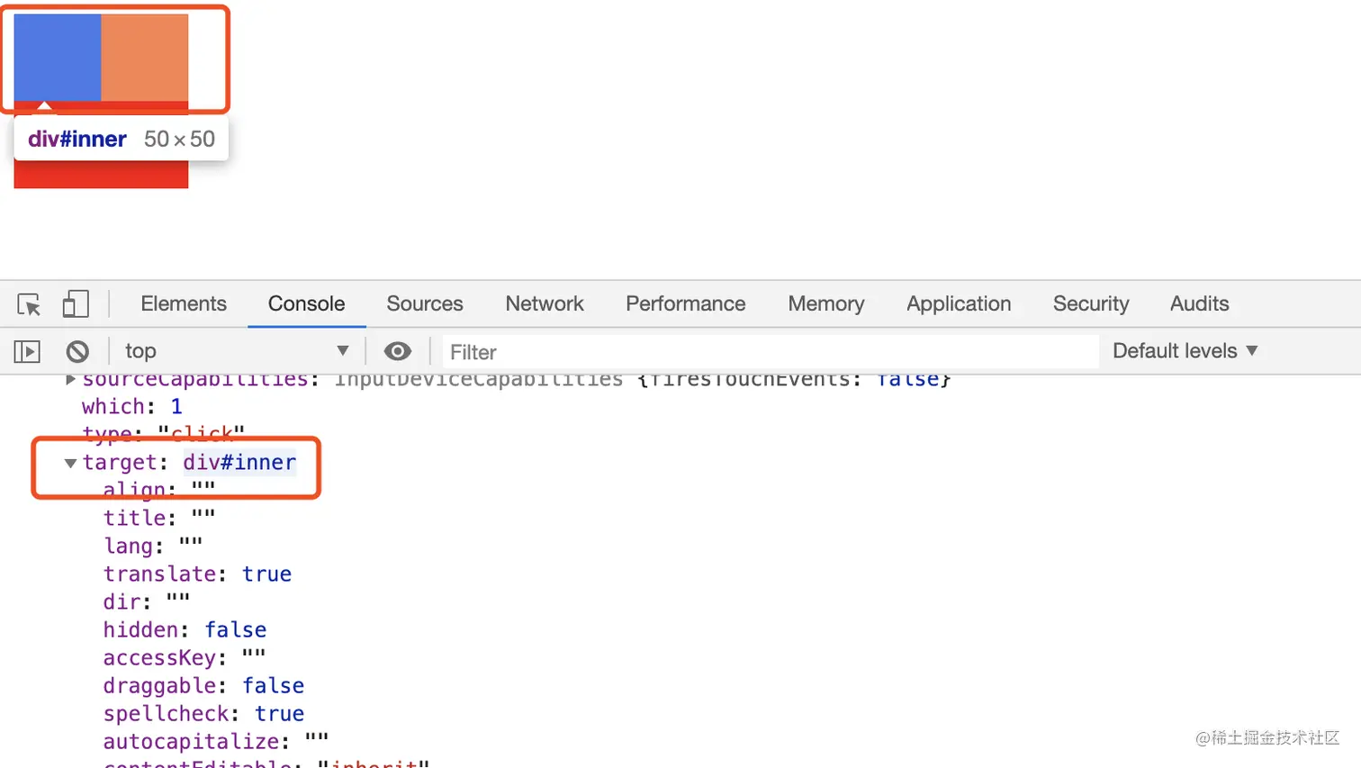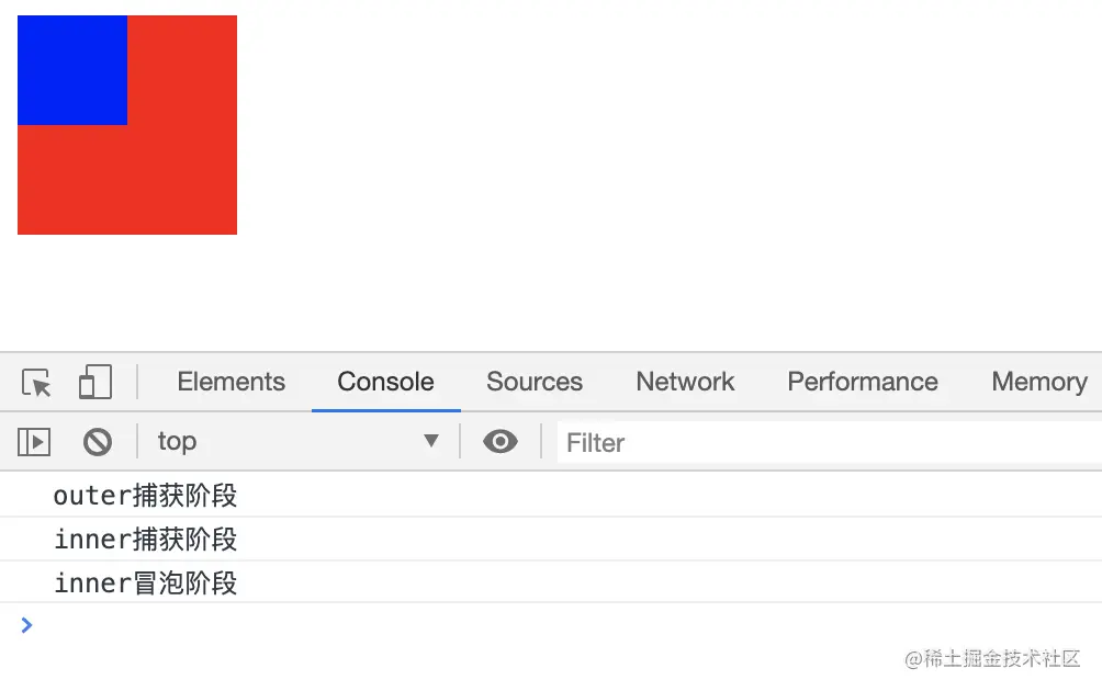 首先是outer捕获阶段 其次是inner捕获阶段 然后是inner冒泡阶段 最后是outer冒泡阶段由此我们可以看到,事件触发的时候实际上都是有捕获和冒泡阶段的,并且捕获阶段会从最外层的父级元素开始捕获,一直捕获到最后触发事件的那个元素点才会停止,那么冒泡阶段反之,会从最内层触发的那个元素开始往外层的父级元素一直冒泡。并且事件的触发是先捕获,在冒泡。